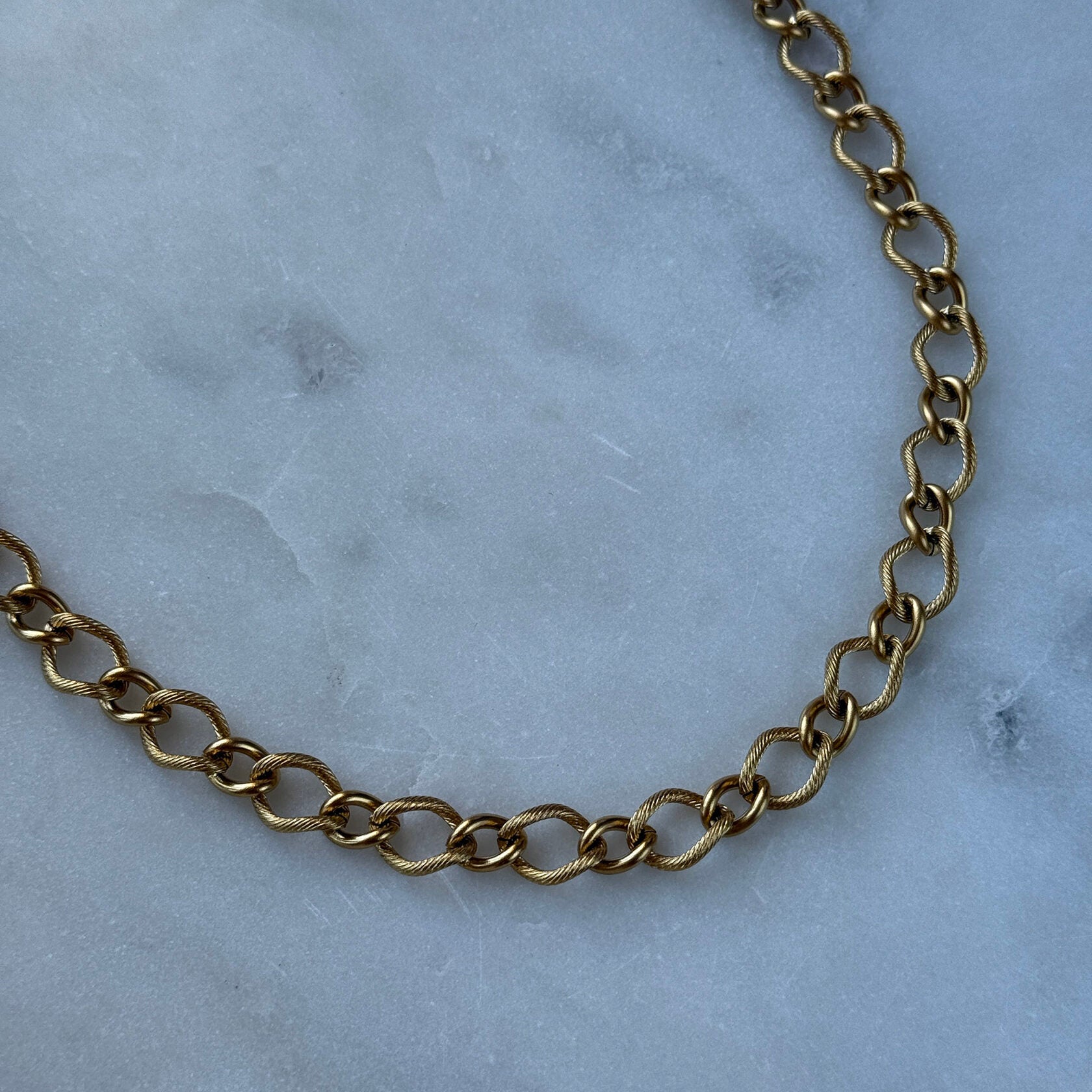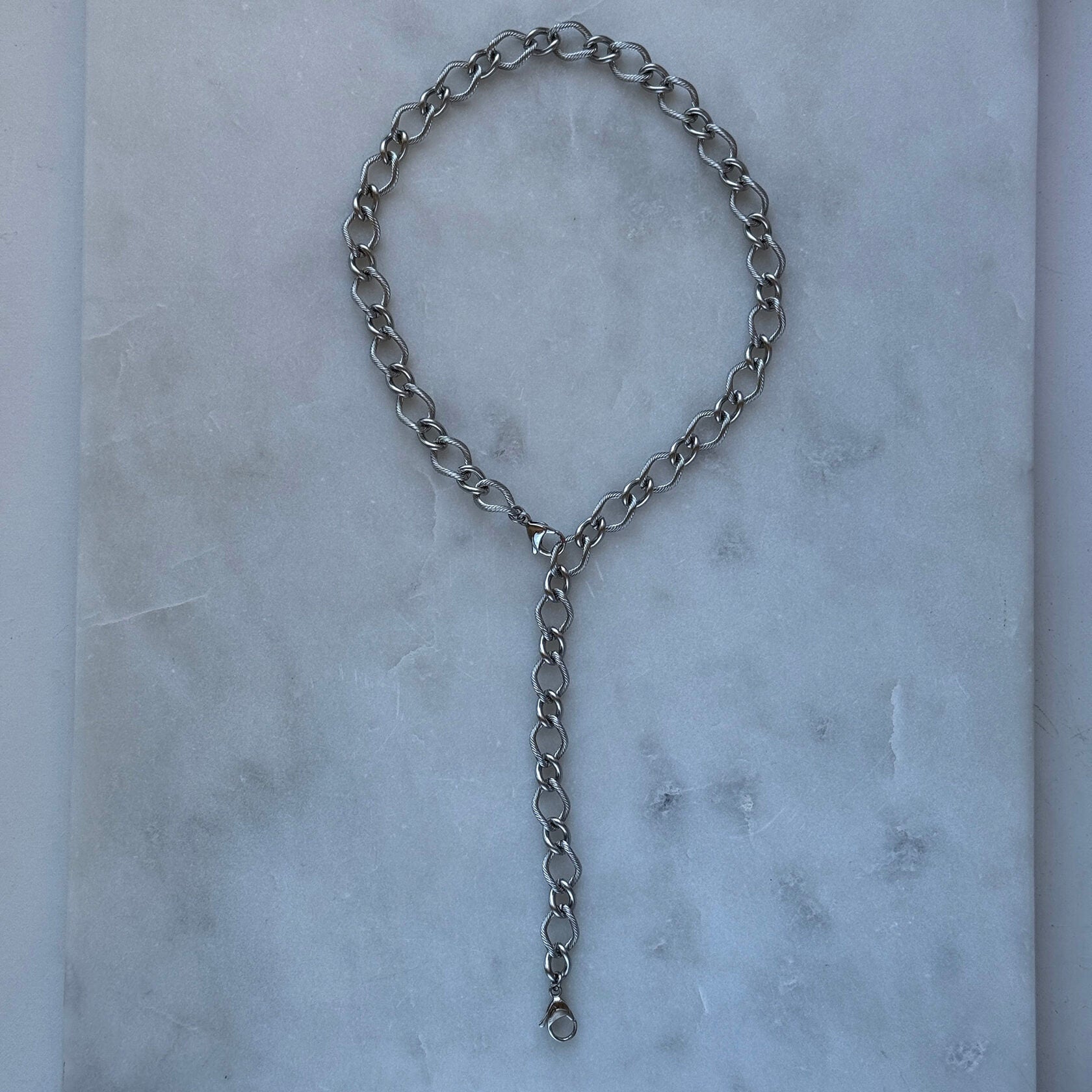 A versatile chain in stainless steel, featuring alternating smooth and textured links. Length: 45 cm with two clasps. You can add any number of clasp charms to design your own unique piece of jewelry.