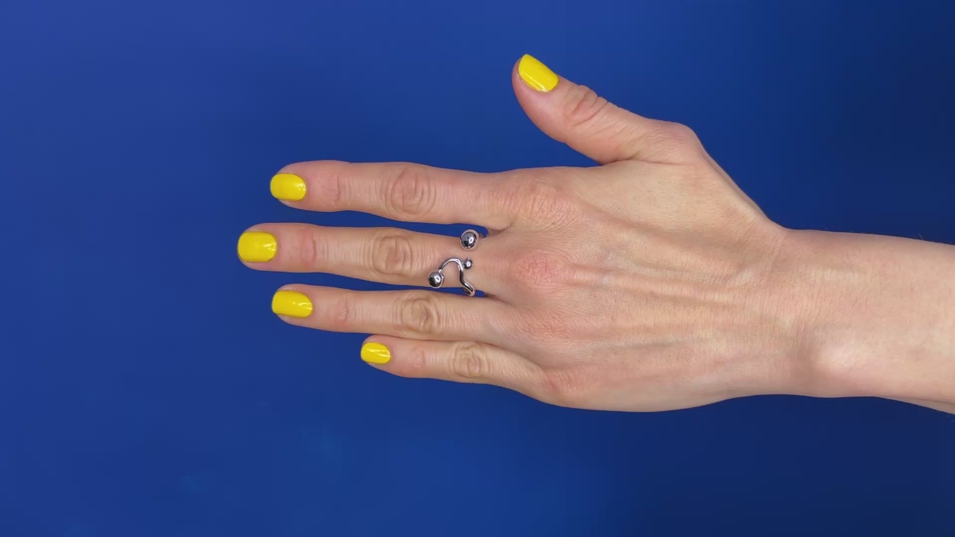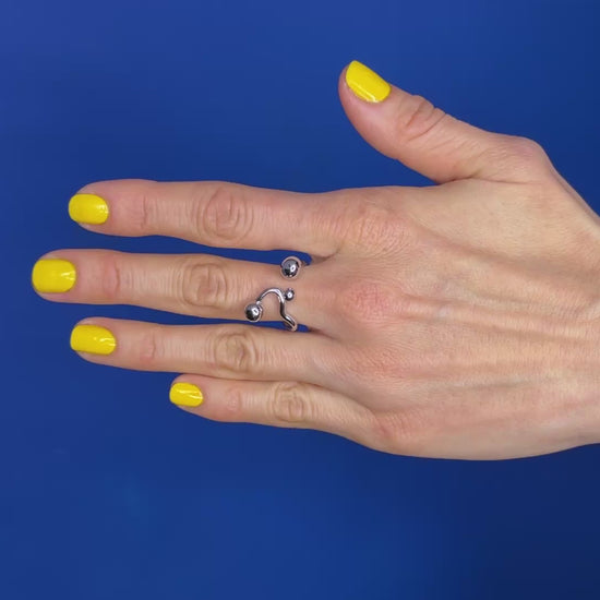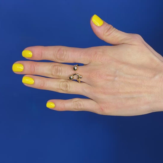 A sculptural gold-plated steel ring featuring interconnected spherical elements that gracefully span multiple fingers. Its polished finish creates a warm glow against the skin, transforming the hand into a modern art piece. Designed for those who appreciate architectural minimalism with a touch of luxury. Hypoallergenic and durable, it makes a sophisticated statement that complements both casual and formal attire.