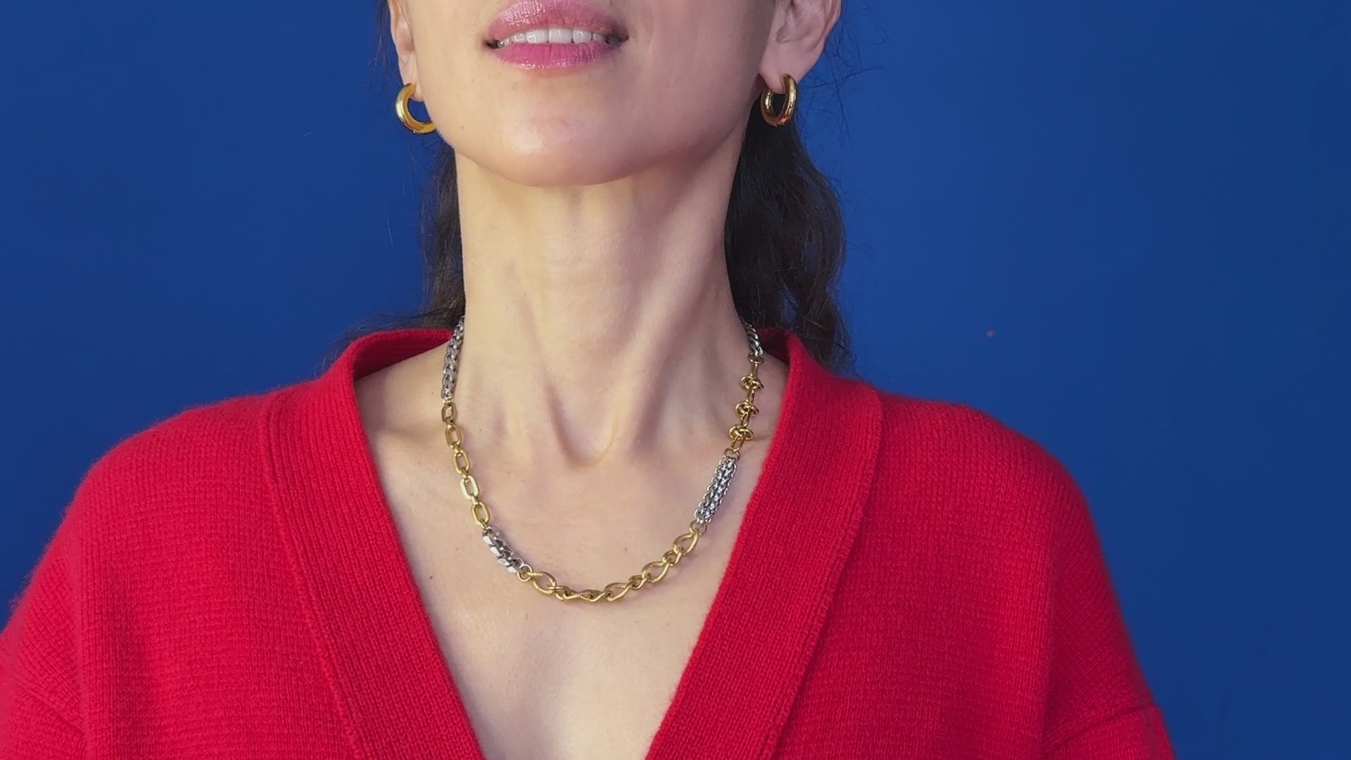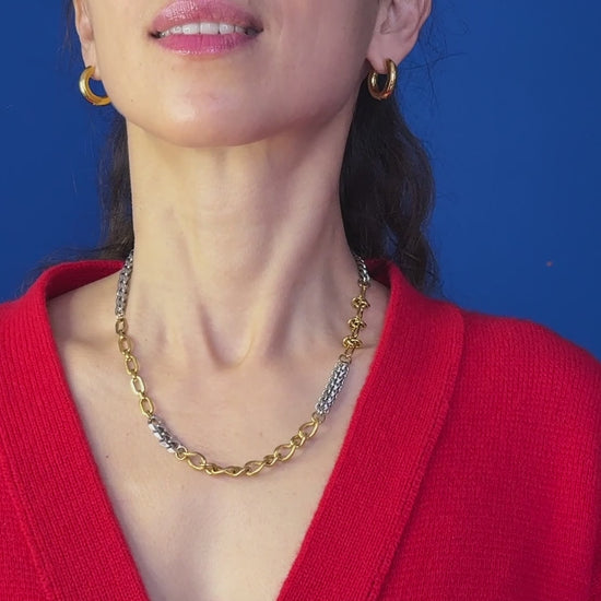 This bicolor chain creates dynamic texture contrast through its dual-tone design, following the law of facture. The alternating gold and silver sections with varied chain textures draw attention while maintaining perfect balance with your facial features. Crafted with 24K gold plating over steel, it enhances your natural beauty through strategic visual interest. Versatile enough for everyday wear, it adds sophisticated contrast without overpowering your look. The mixed textures create a modern, edgy aesthetic that complements both casual and formal outfits.