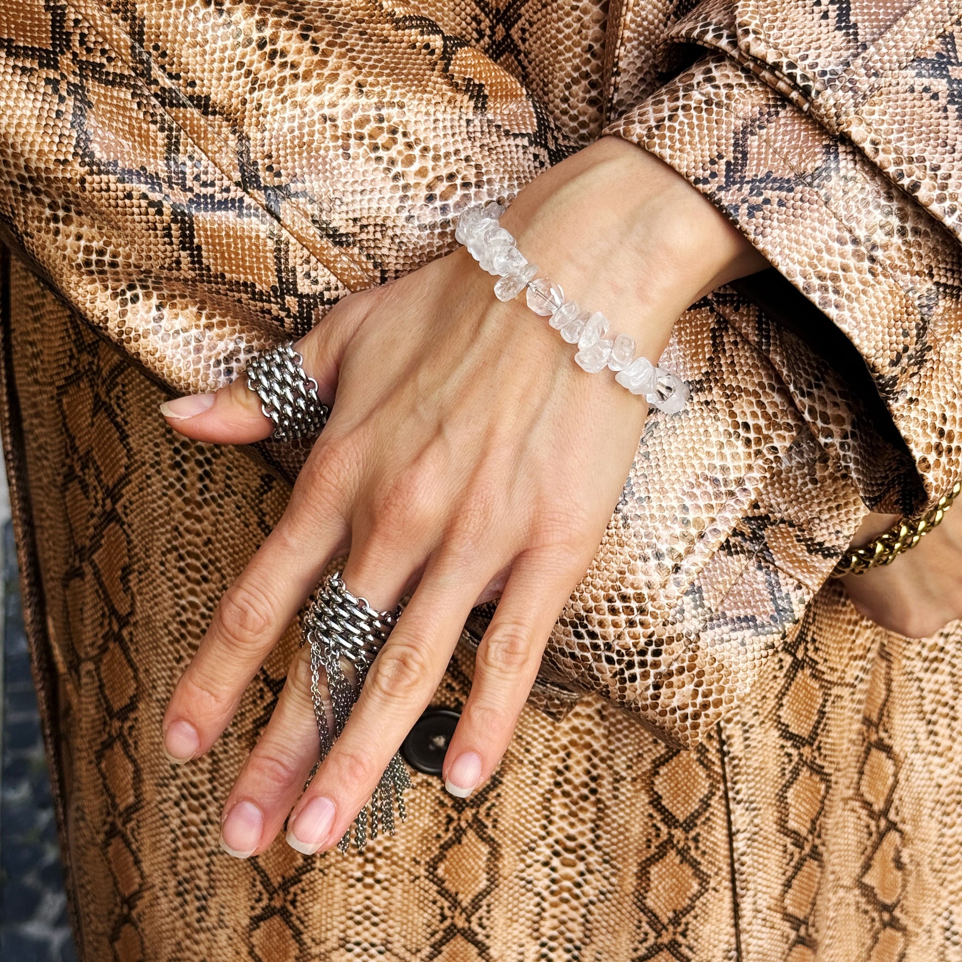 This elegant rock crystal bracelet creates perfect harmony through its natural transparency and texture. Following the law of correspondence, the clear crystals complement skin tones while steel elements add subtle contrast. The organic crystal shapes balance facial features with gentle irregularity. Versatile for everyday wear, it enhances your natural beauty through strategic simplicity without overpowering your look. The natural rock crystal brings clarity and refinement to any ensemble.