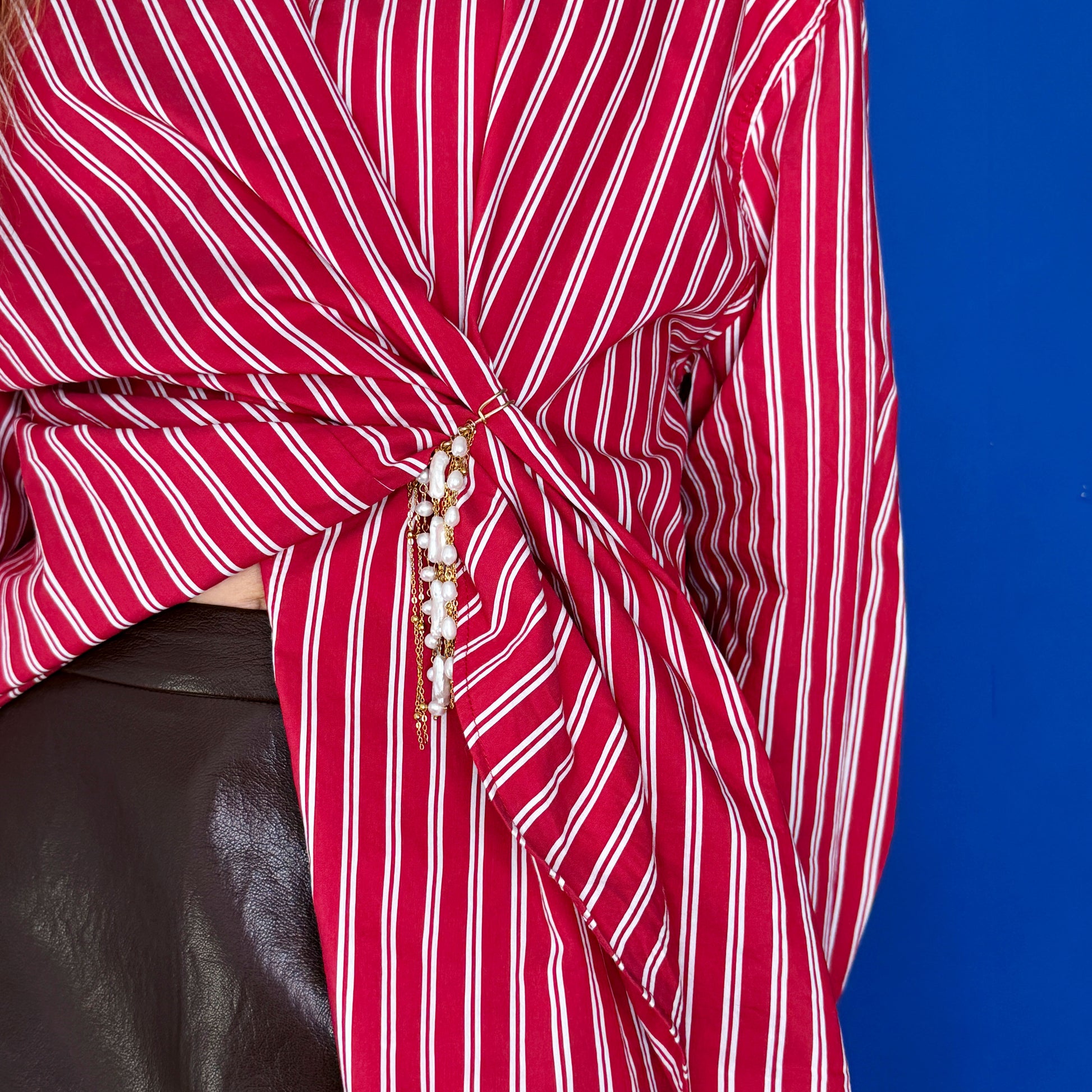 This statement brooch creates dynamic contrast through its cascading pearl and chain design, following the law of texture correspondence. Crafted with natural pearls and 24K gold-plated steel, it adds movement and sophistication to any outfit. The layered chains and pearls draw attention while maintaining balance with your natural features. Versatile for both casual and formal wear, it transforms simple ensembles with its modern, elegant aesthetic that enhances your personal style through strategic visual interest.