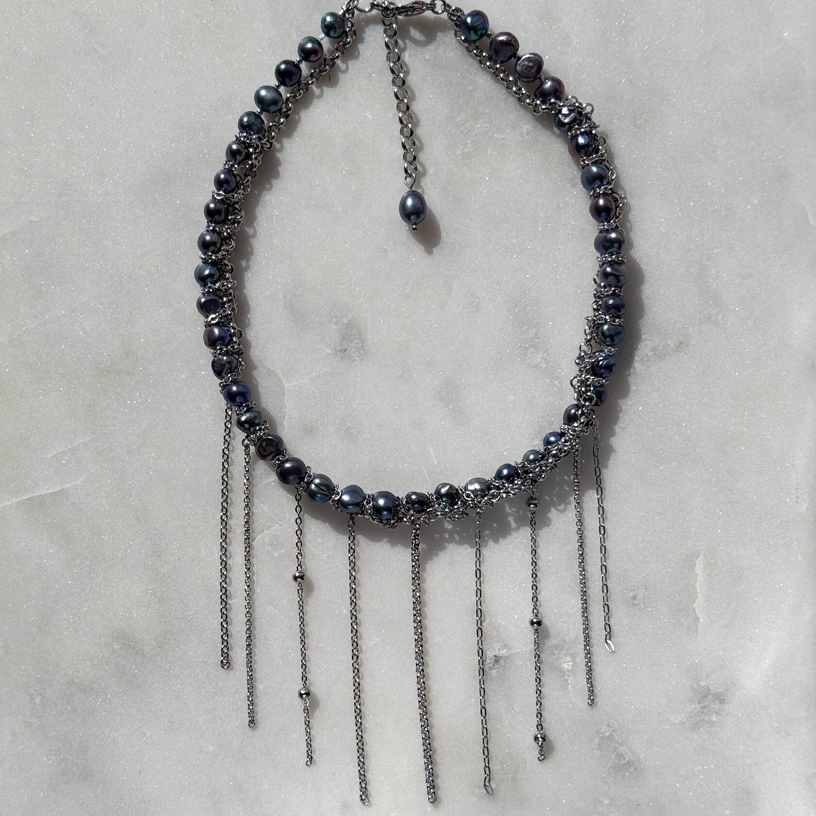 A dramatic and elegant necklace featuring natural black pearls paired with cascading stainless steel chains. The deep, iridescent pearls bring a sense of mystery and sophistication, while the chain fringe adds a modern, dynamic touch. This statement piece evokes the beauty of starlit skies and celestial movements, perfect for special occasions or adding a bold accent to everyday wear. Crafted from durable, tarnish-resistant stainless steel, this necklace ensures both style and longevity.