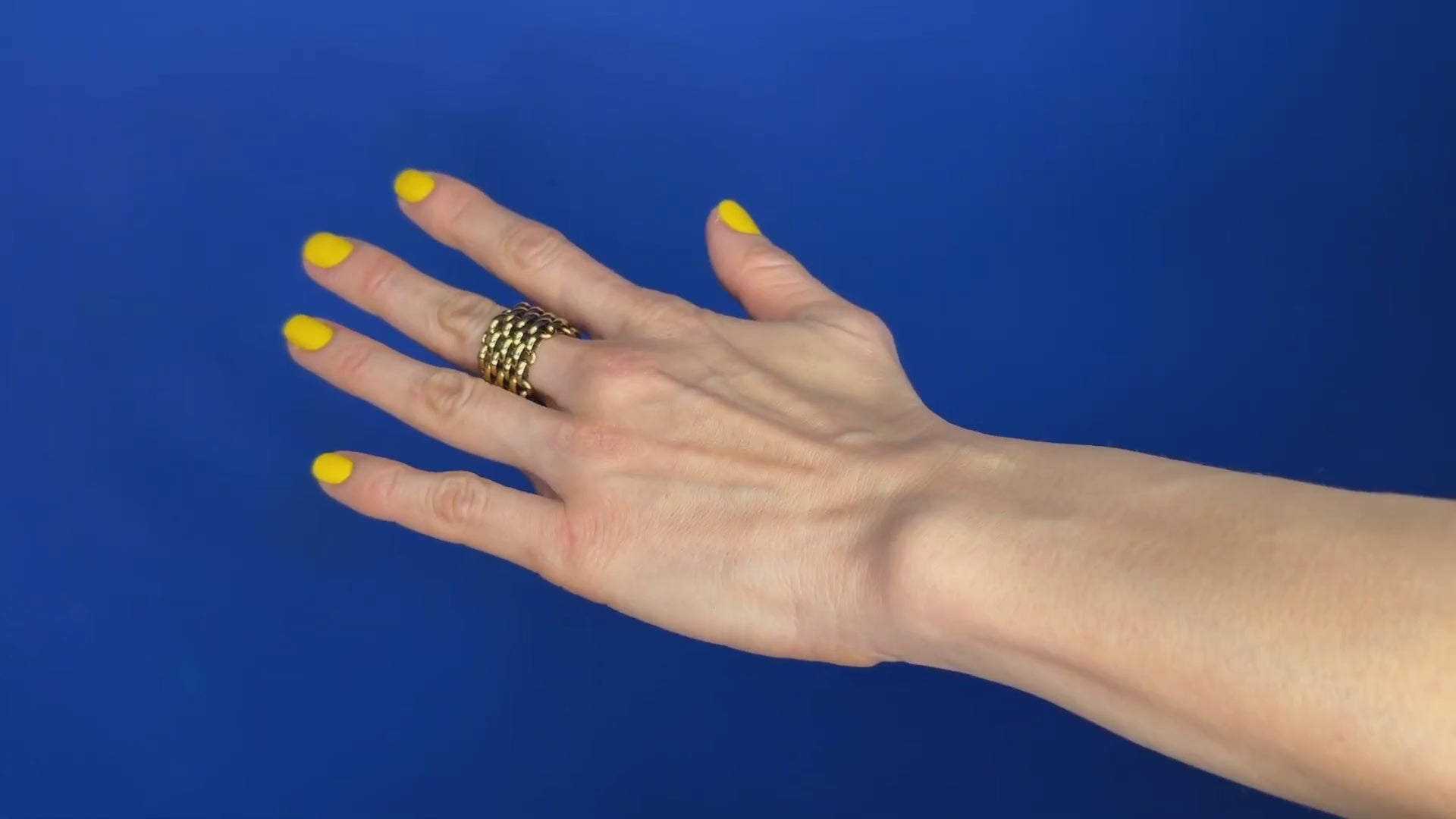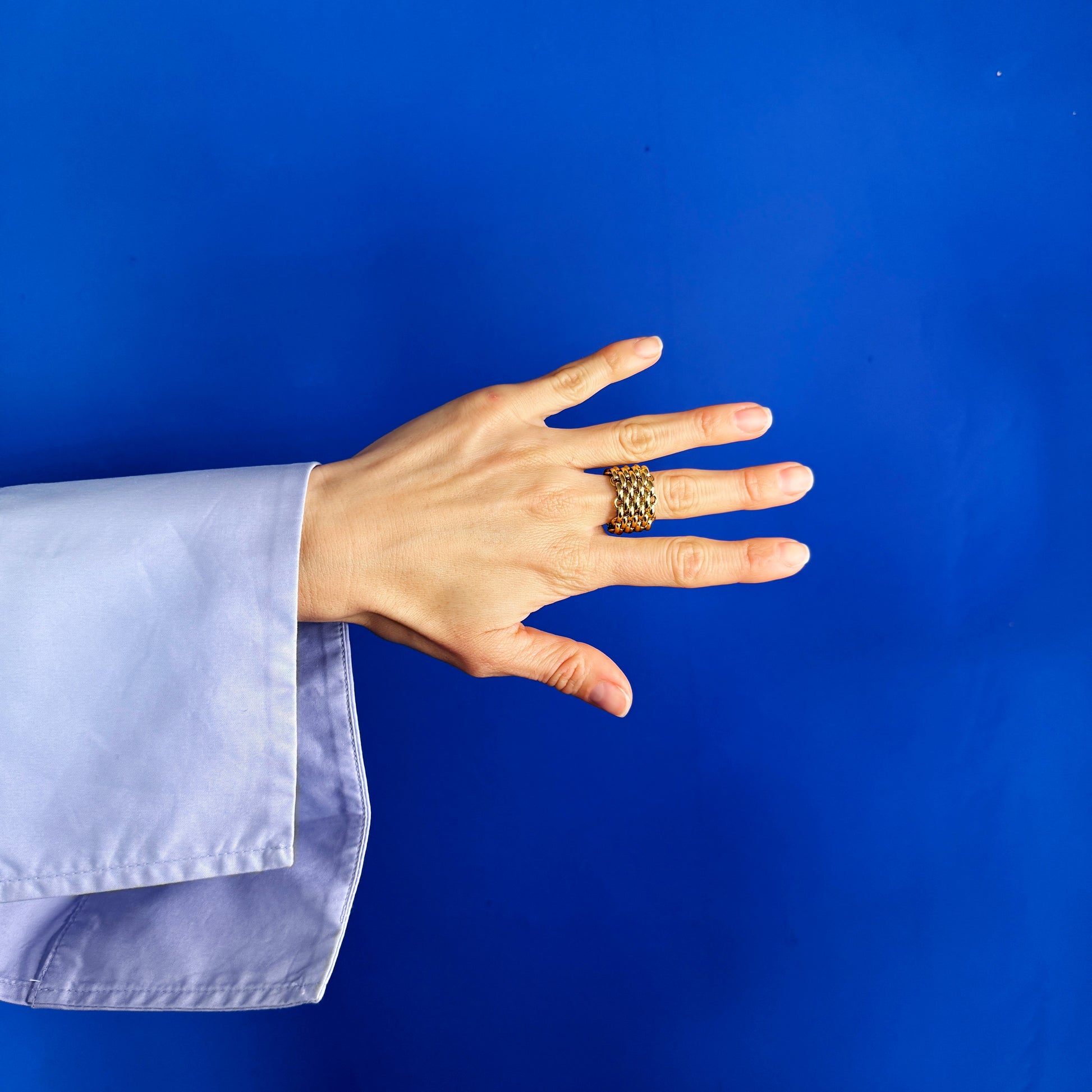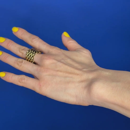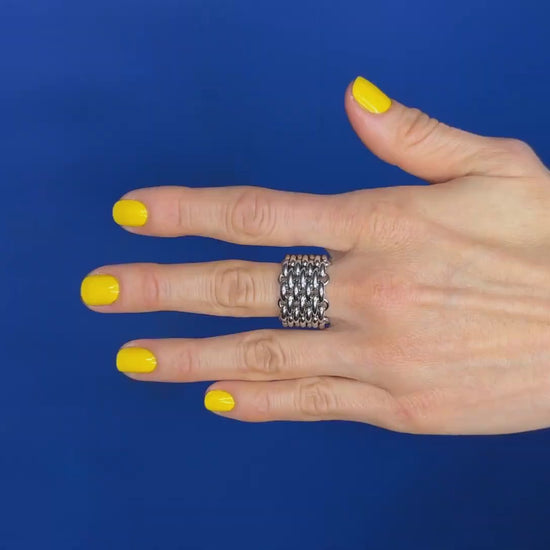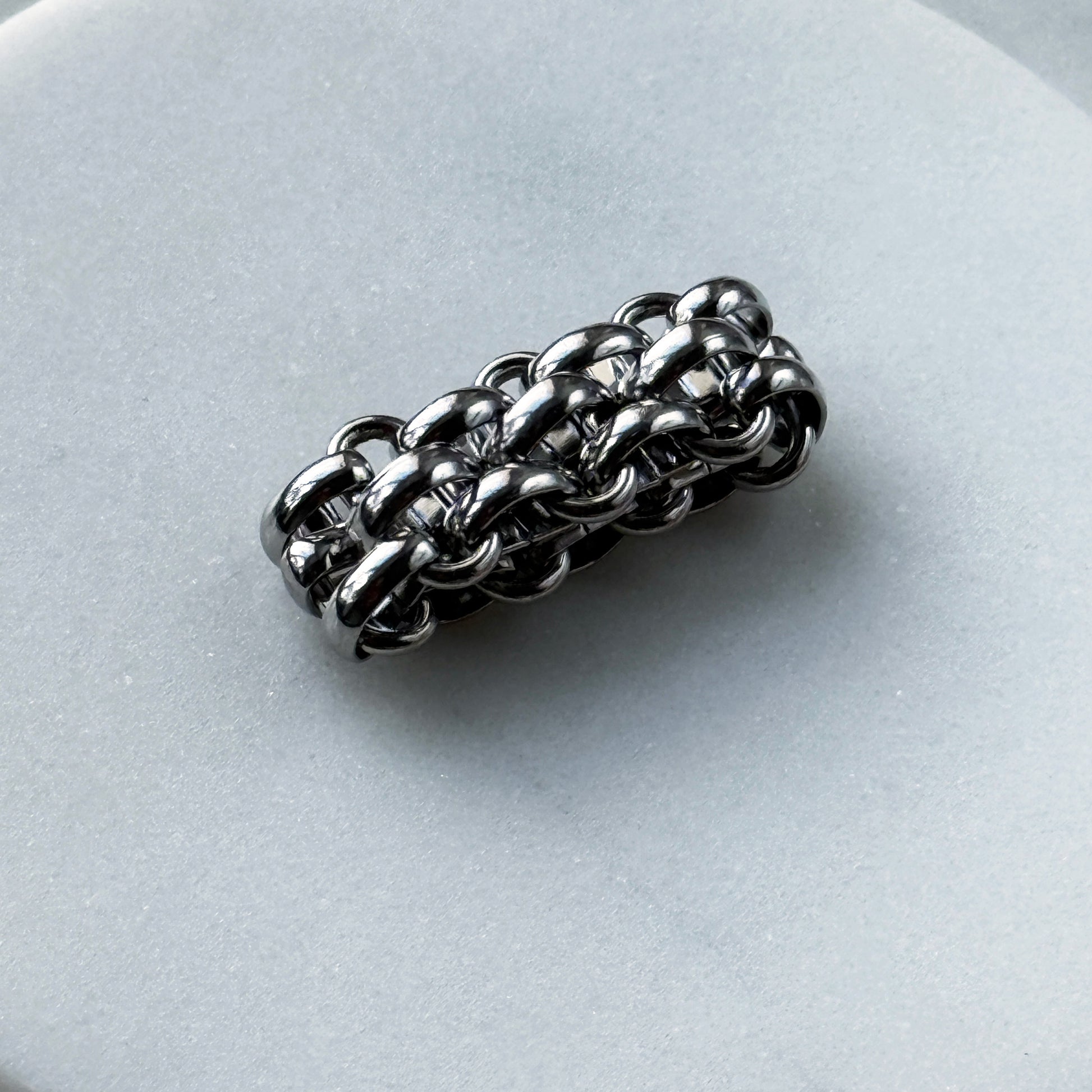 A bold, multi-row steel ring with a chainmail-inspired design. Its textured, interlocking links create a striking, armor-like look that wraps around the finger. Perfect for making a statement alone or as part of a layered set, this durable and modern piece adds edgy sophistication to any outfit.