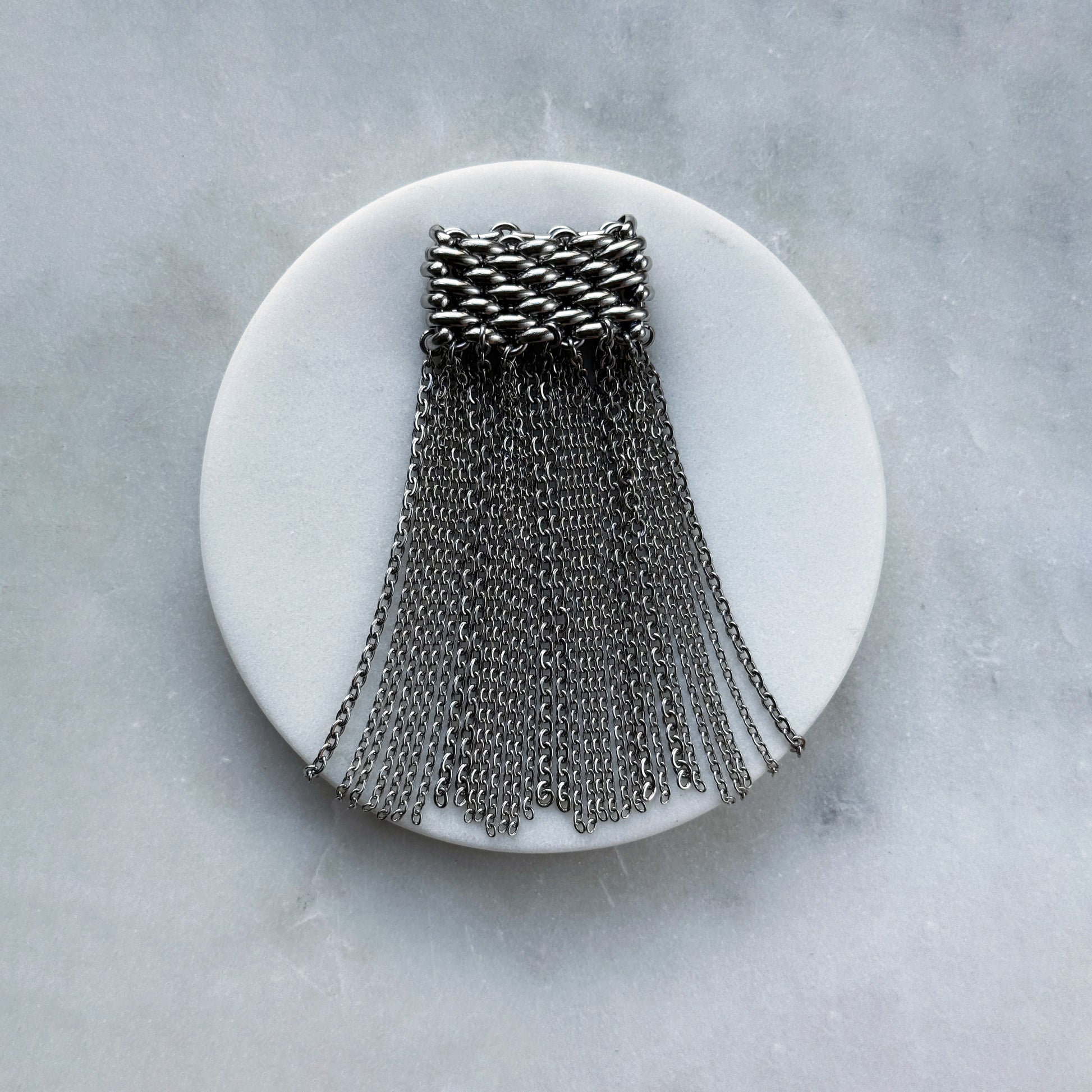 This statement chainmail ring with cascading fringe creates dynamic visual interest through contrast. The intricate steel construction draws attention to your hands while complementing your natural features. As a versatile piece in your jewelry wardrobe, it transforms your look by adding movement and texture. Lightweight yet impactful, this architectural design enhances your style through the law of contrast, making it perfect for both casual and formal occasions.