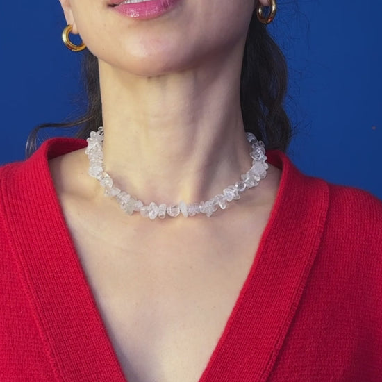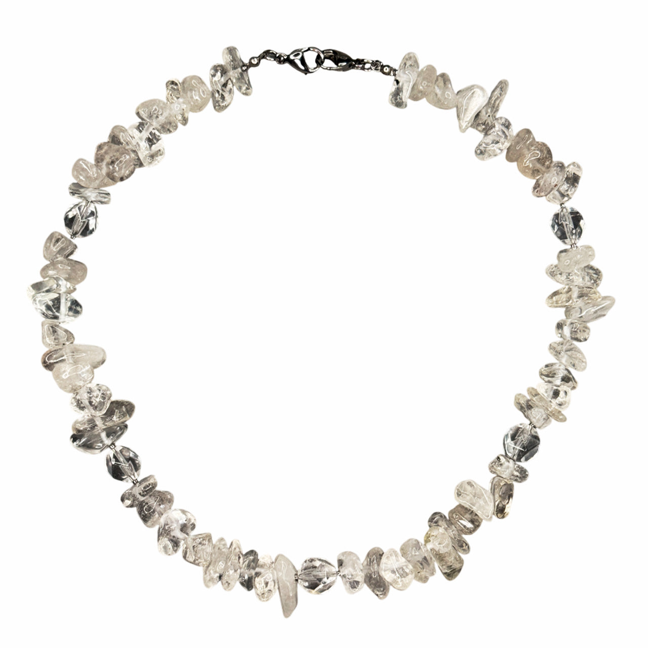 This elegant rock crystal choker creates perfect harmony through its natural transparency and texture. Following the law of correspondence, the clear crystals complement skin tones while steel elements add subtle contrast. The organic crystal shapes balance facial features with gentle irregularity. Versatile for everyday wear, it enhances your natural beauty through strategic simplicity without overpowering your look. The natural rock crystal brings clarity and refinement to any ensemble.