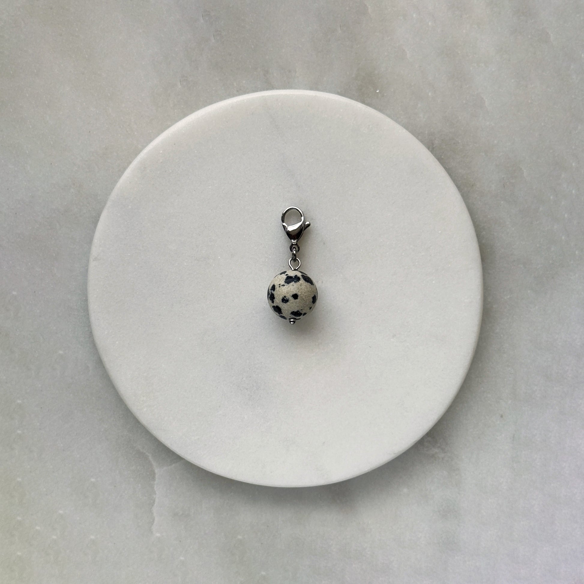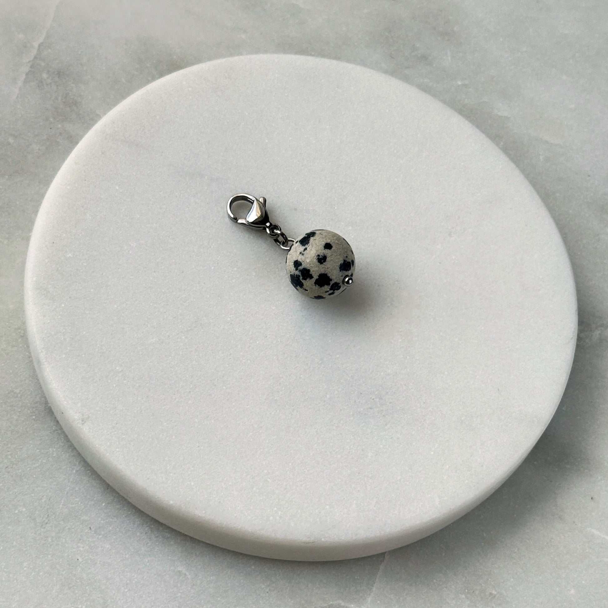 A polished Dalmatian jasper sphere, its creamy surface dotted with bold black spots, hangs from a sleek steel clasp. The stone’s playful pattern contrasts beautifully with the cool metal, creating modern earthiness. Lightweight and eye-catching, it’s a grounded yet whimsical accent — nature’s artistry captured in minimalist form.