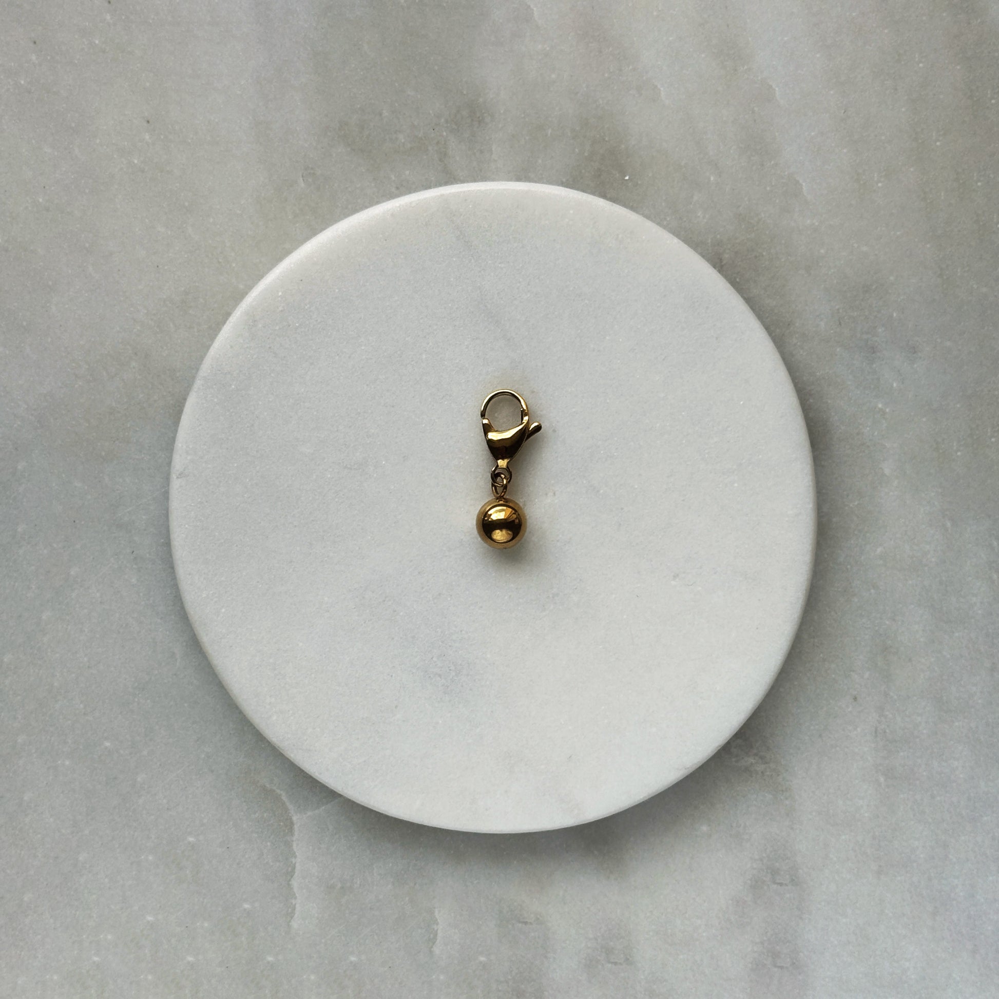 A polished golden sphere, perfectly round and radiant, hangs from a matching gold-toned clasp. Its smooth surface catches light with quiet brilliance, embodying minimalist luxury. Crafted from steel with 24k gold plating, it’s a timeless accent — pure, elegant, and effortlessly sophisticated for personalizing your everyday essentials