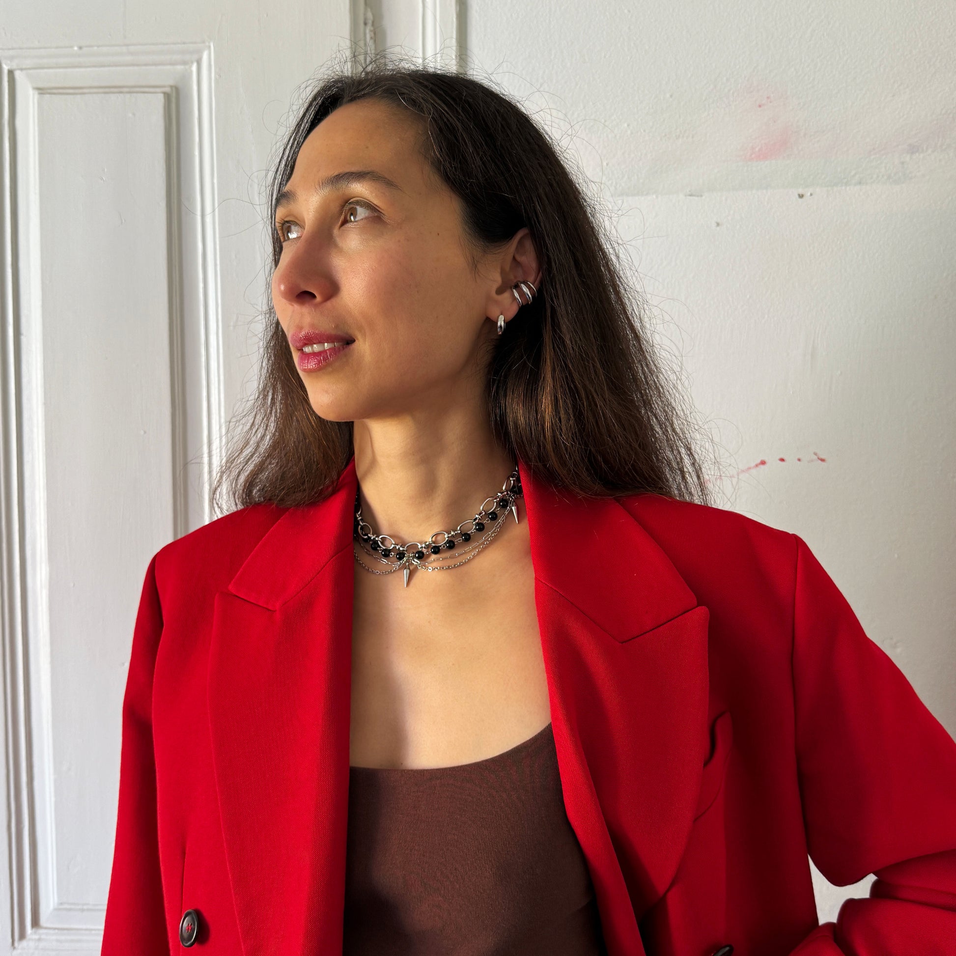 Crafted with black agate beads and steel chains, this Gothic necklace creates striking contrast through dark, polished stones against metallic links. Following the law of correspondence, its balanced structure enhances facial features while maintaining edgy elegance. Versatile for both casual and formal wear, it adds bold sophistication through strategic texture and timeless gothic design, elevating any ensemble with harmonious proportions.