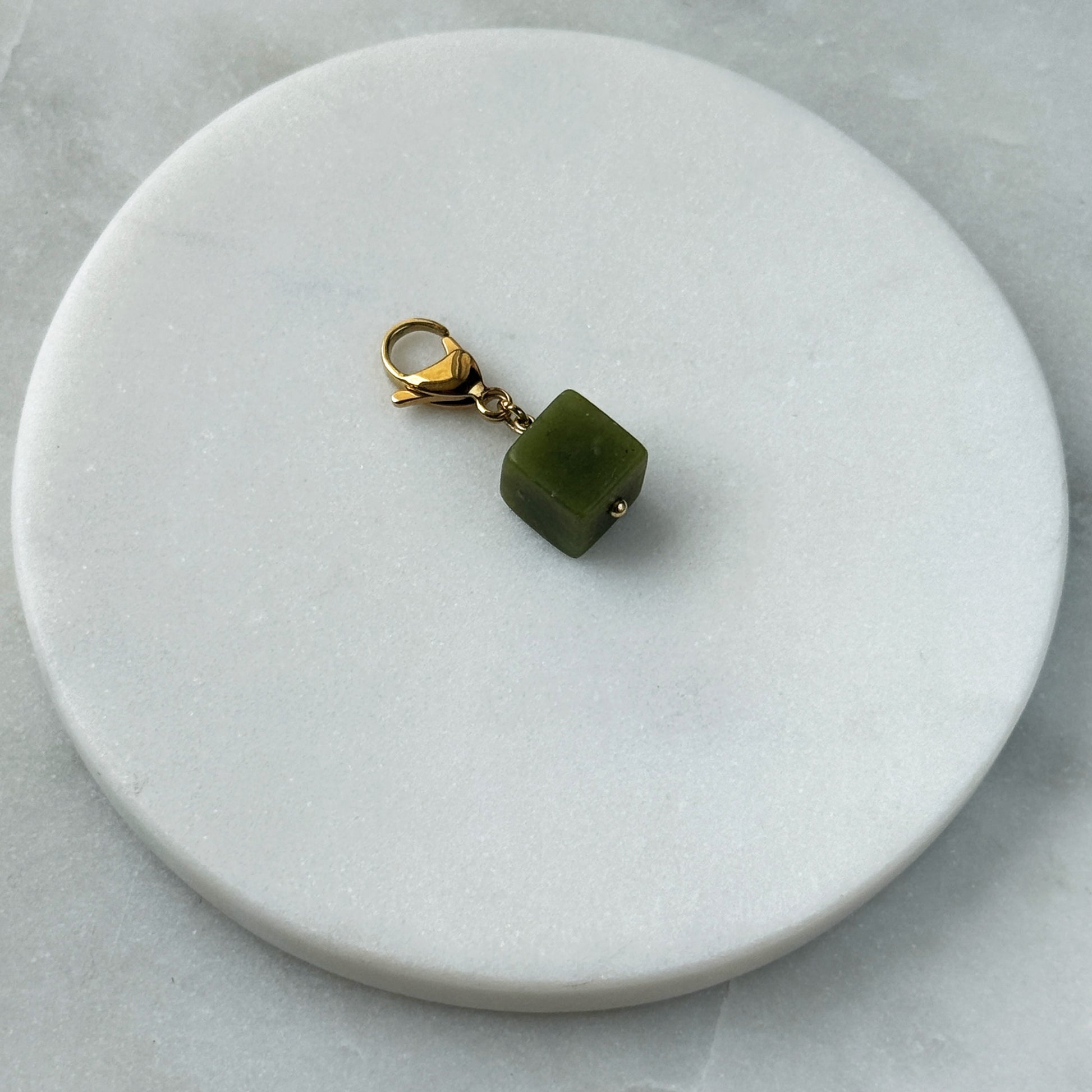 A compact, polished green nephrite cube rests on a sleek steel carabiner, its earthy tone and sharp geometry offering modern contrast. The cool metal complements the stone’s organic depth without overpowering it. Lightweight and versatile, it’s an understated accent for bags or chains — minimalist design with quiet, natural presence