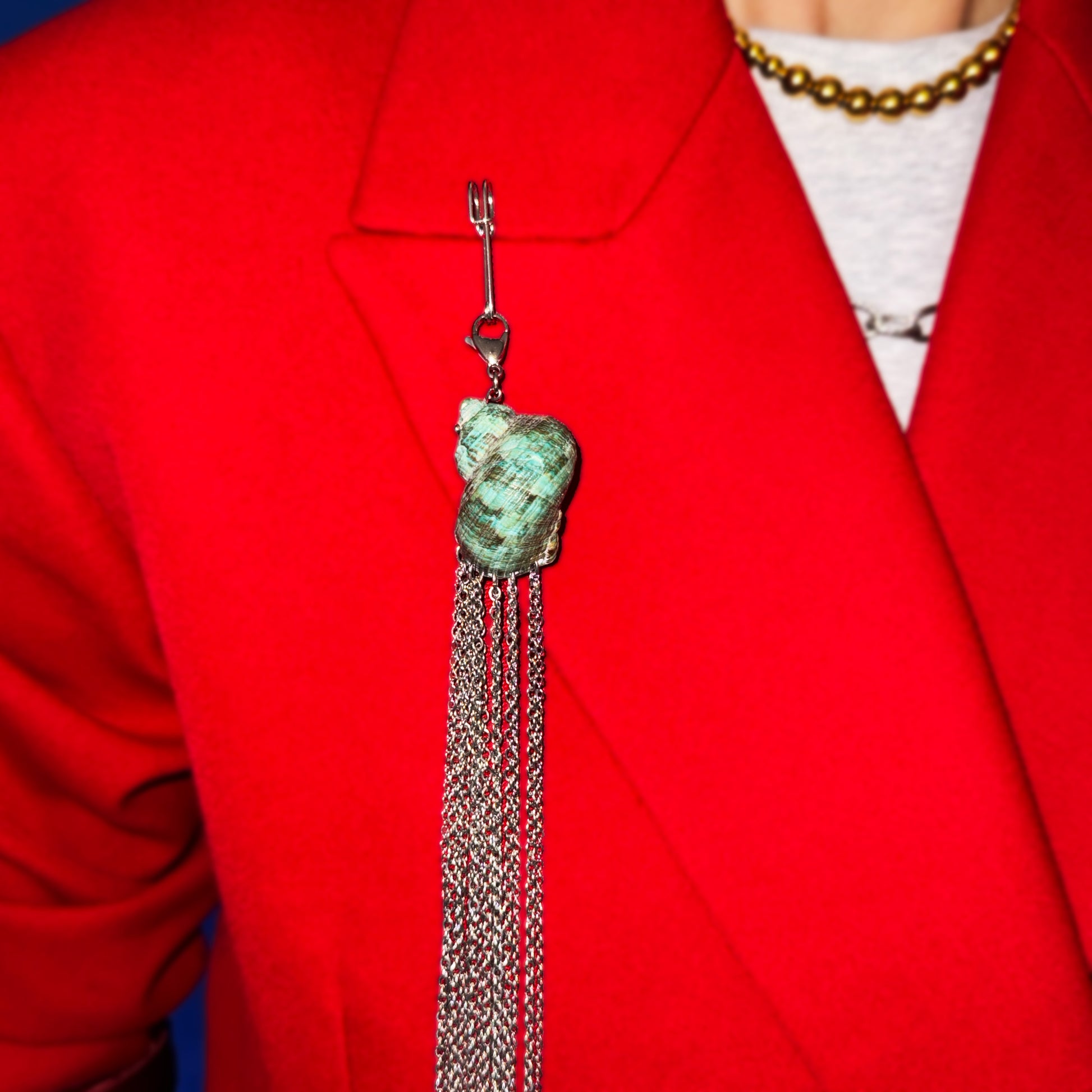 Ocean elegance meets modern design: This unique brooch features a natural green shell with organic texture suspended above cascading steel chains. The contrast between earthy shell tones and polished metal creates striking visual depth. Perfect for elevating jackets or adding coastal sophistication to evening wear, it moves gracefully with every step. Wear as a statement piece or pair with complementary accessories for layered styling that embodies the serene beauty of ocean-inspired fashion.