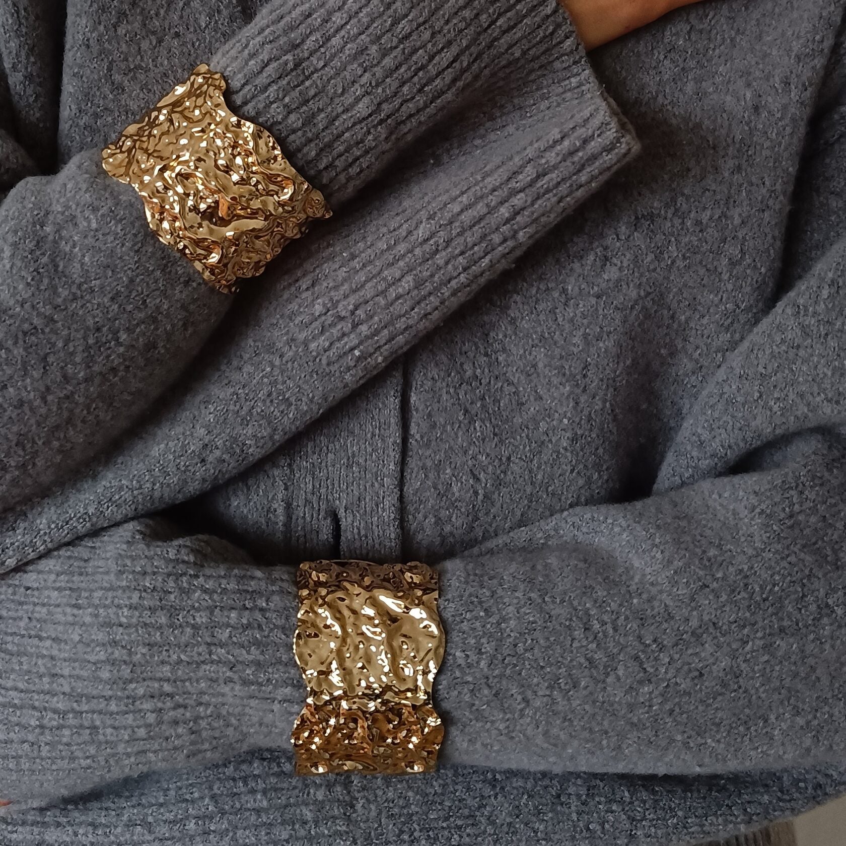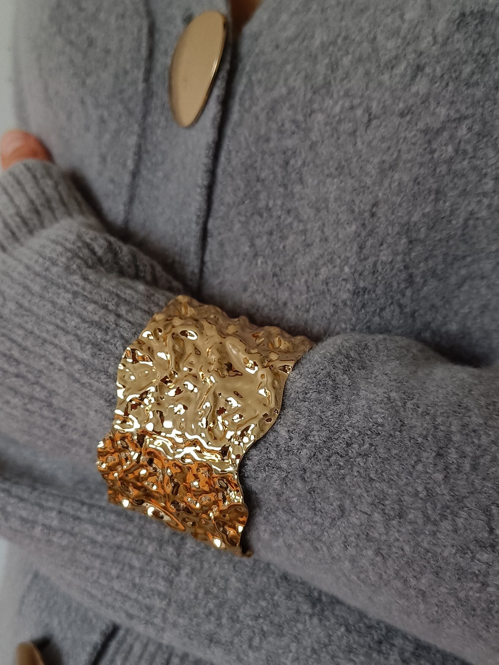 A timeless cuff bracelet crafted from stainless steel with a polished, hammered texture. The hand-finished detailing creates a dynamic surface that catches and reflects light beautifully, adding depth and character to the piece. Sleek yet bold, this bracelet complements both casual and formal looks with ease. Durable and tarnish-resistant, it’s designed for long-lasting wear, offering a sophisticated blend of elegance and edge for any occasion.