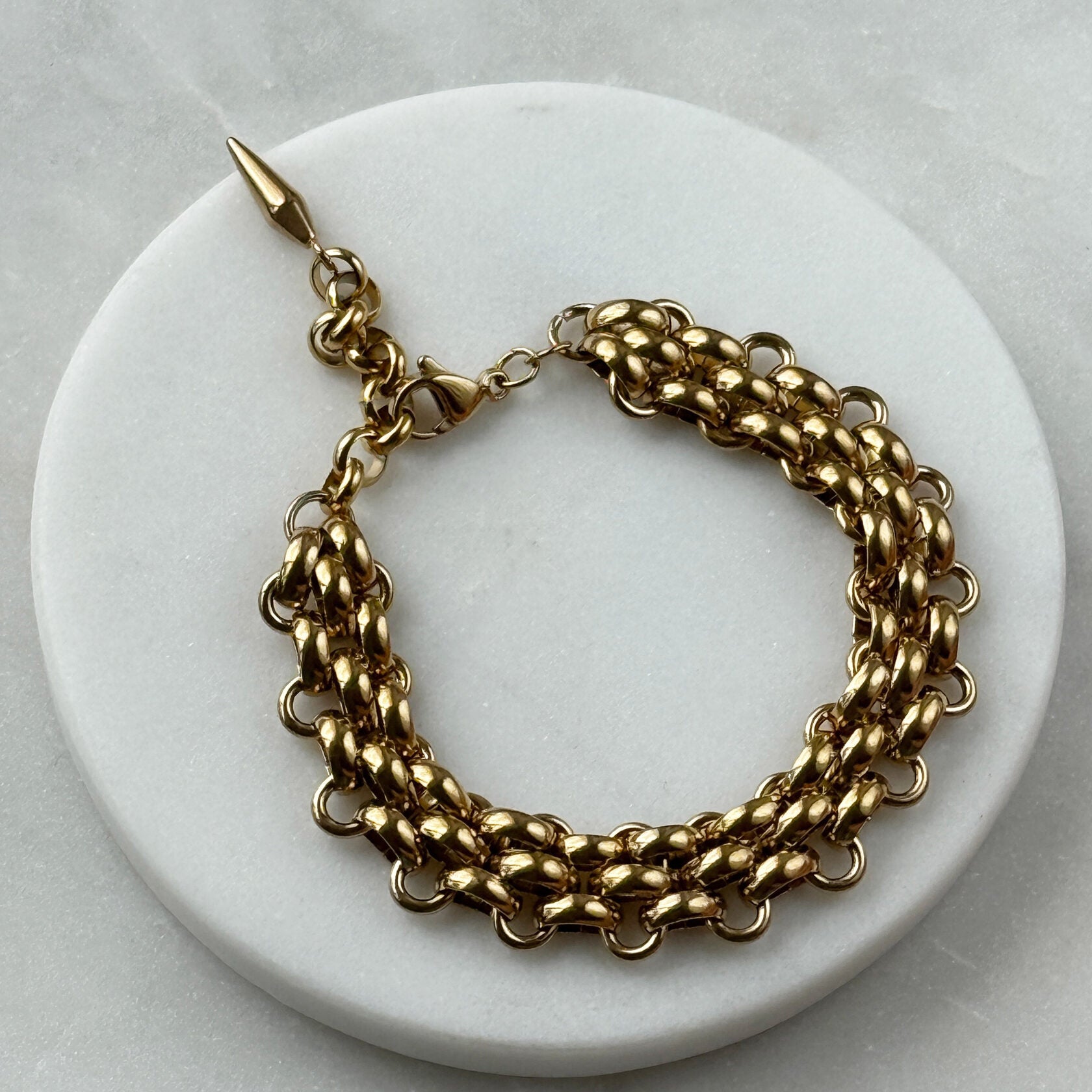 This statement gold chain bracelet creates balanced contrast with its substantial, textured design. Following the law of proportion, its size complements bold personal style while enhancing natural features through strategic visual interest. Crafted with 18K gold plating over steel, it works with both casual and formal outfits. The chunky chain design draws attention to your best features without overpowering your look.