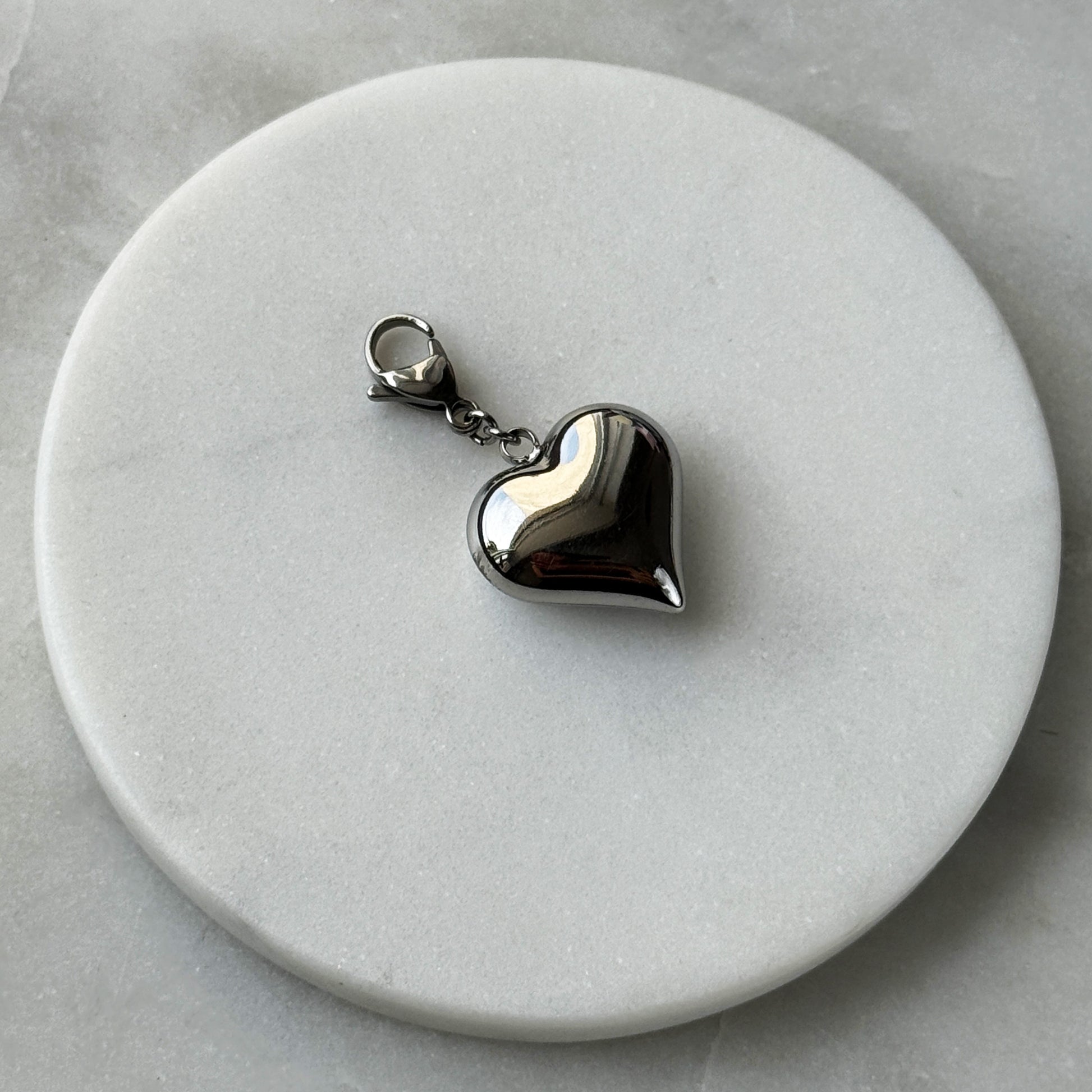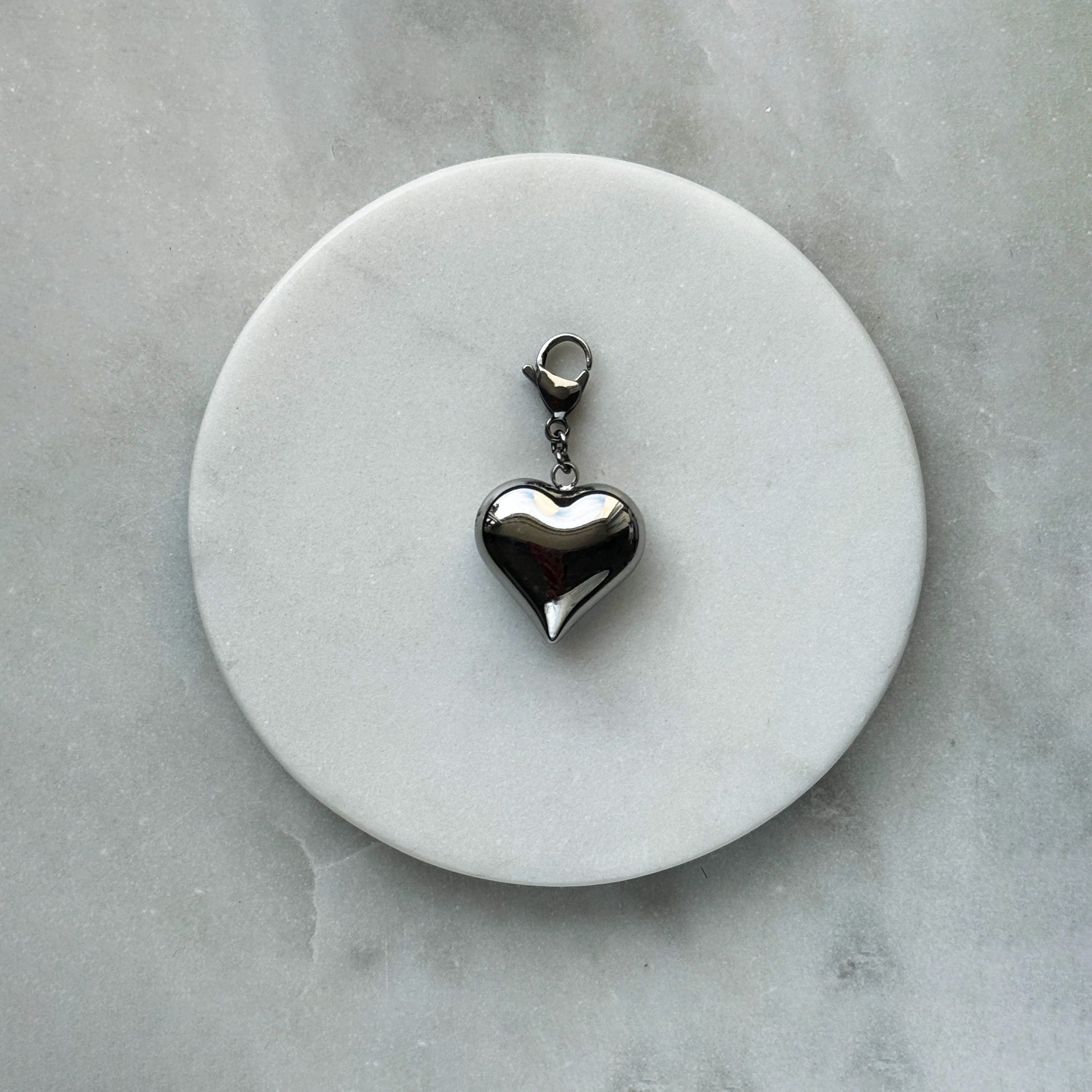 A bold, oversized heart pendant in polished steel with a sleek carabiner clasp. Its reflective surface catches light with quiet confidence, making it a statement piece for the modern romantic. Perfect for layering or attaching to bags, it’s designed for those who embrace love as strength. Itt’s your daily reminder that elegance doesn’t need to be subtle.
