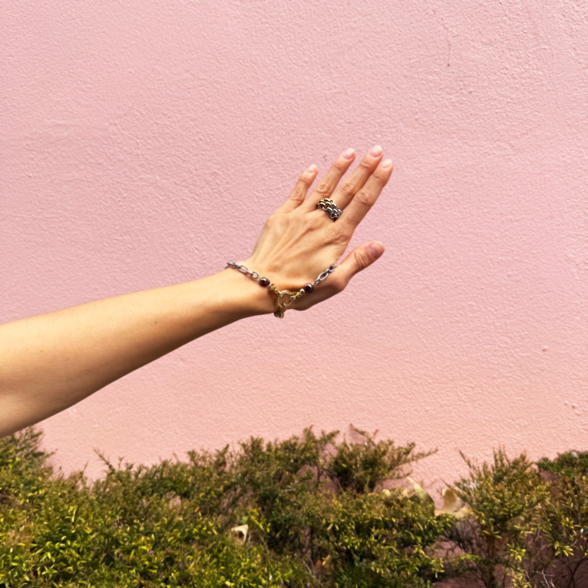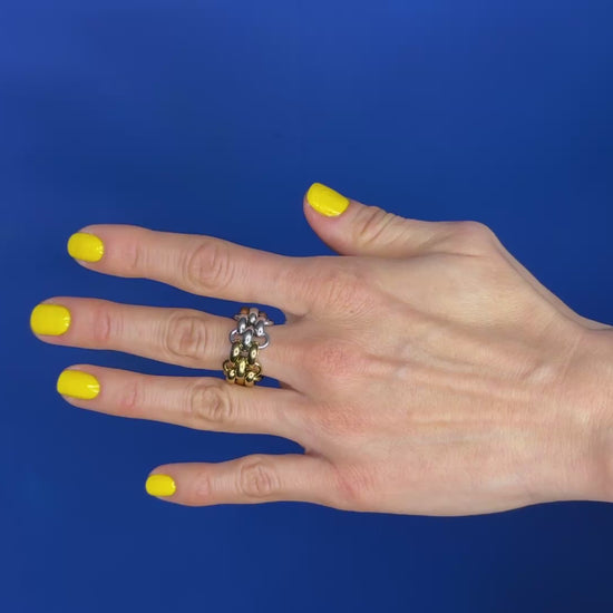 The Mixed Metal Chain Ring combines the strength and sleekness of stainless steel with the elegance of 18-carat gold plating. Featuring an intricate woven chain design, this ring creates a stunning contrast between the silver and gold elements. The bold and modern style makes it a perfect statement piece for any occasion. Crafted from high-quality materials, this ring is both durable and stylish, offering a unique addition to your jewelry collection.