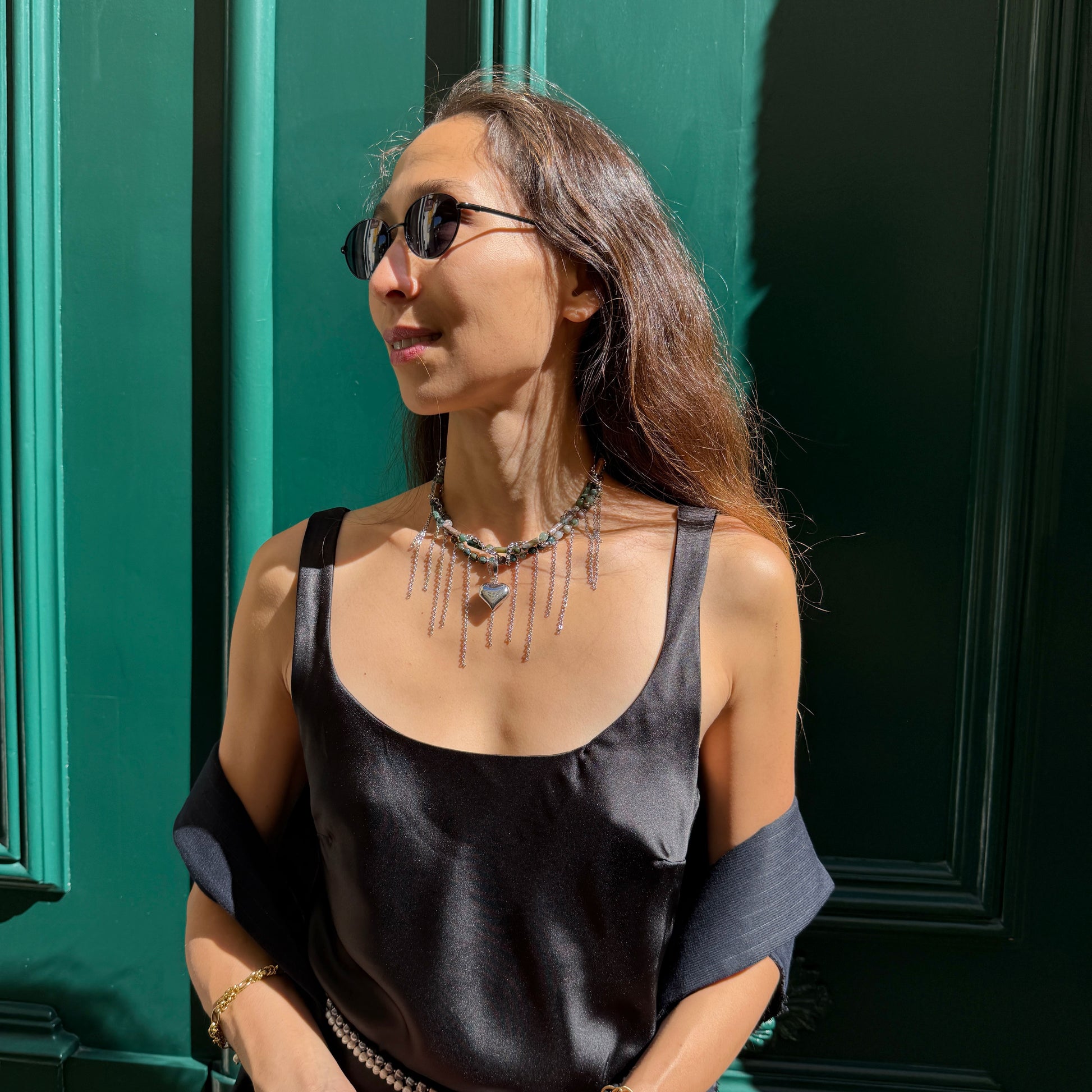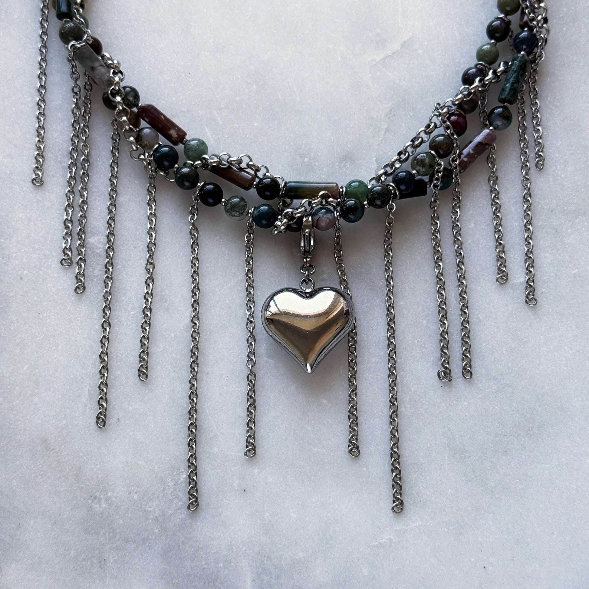 A vibrant mix of earthy Indian agate beads in deep greens, browns, and greys is woven into a textured chain, finished with delicate metallic fringe. A polished heart charm dangles at the center, adding a touch of romance. Crafted with durable steel, this bold yet balanced piece brings bohemian spirit to any look