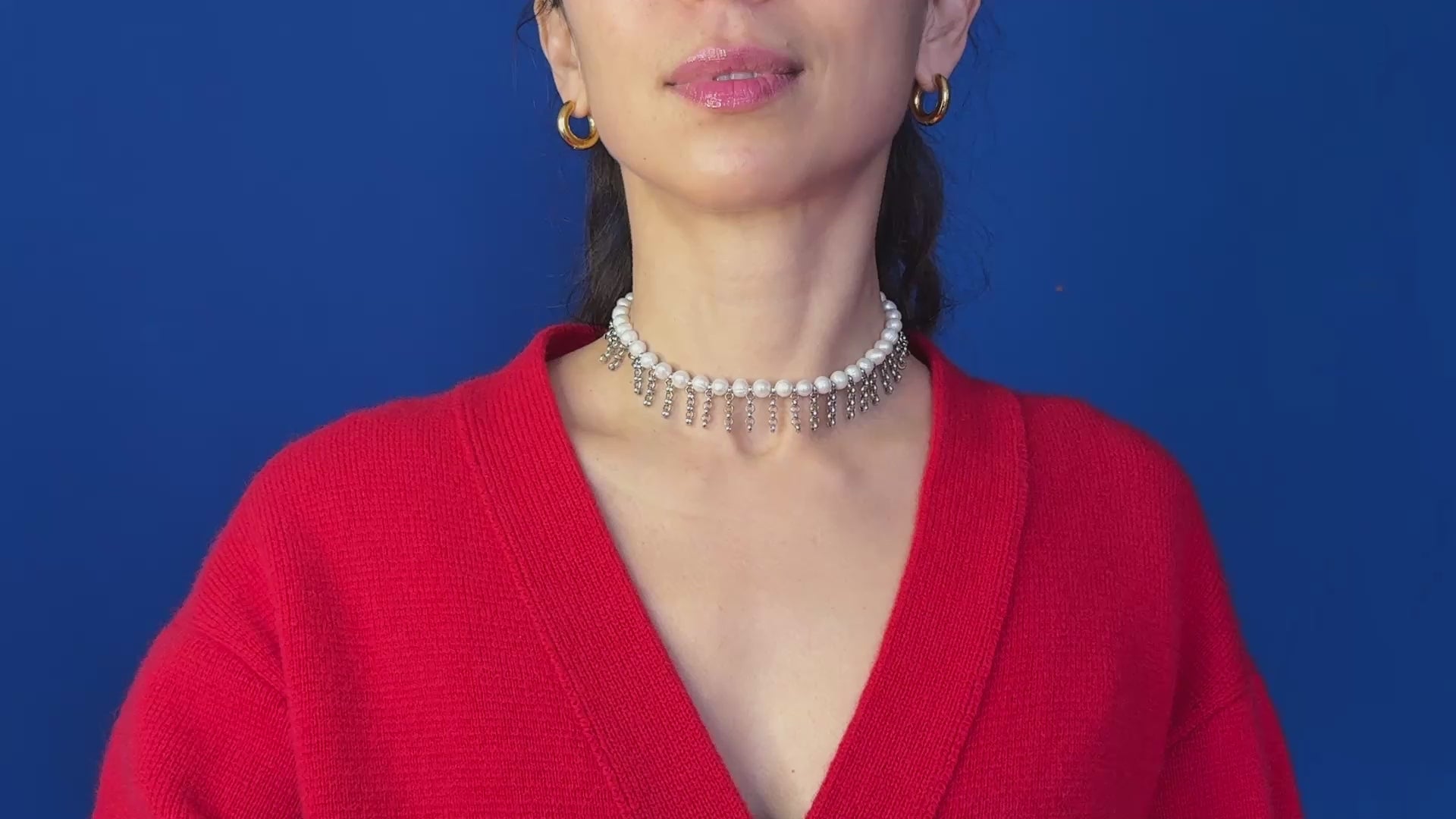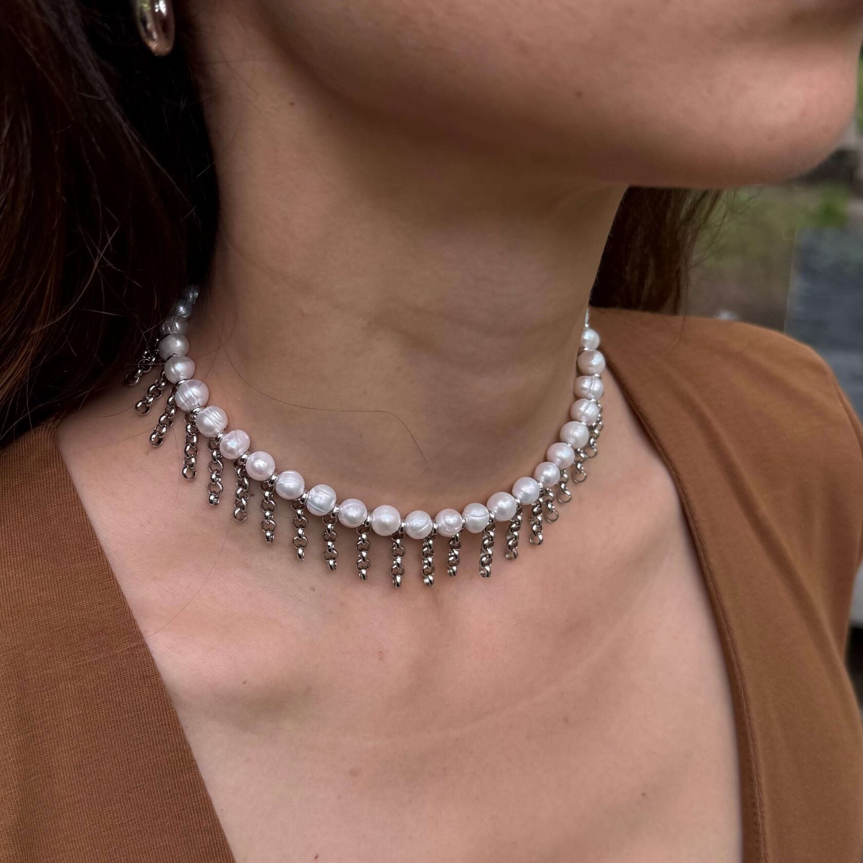 A sophisticated choker made with lustrous natural pearls, accented by dangling stainless steel chains that create a delicate fringe effect. This piece blends timeless elegance with a modern twist, perfect for elevating any neckline.