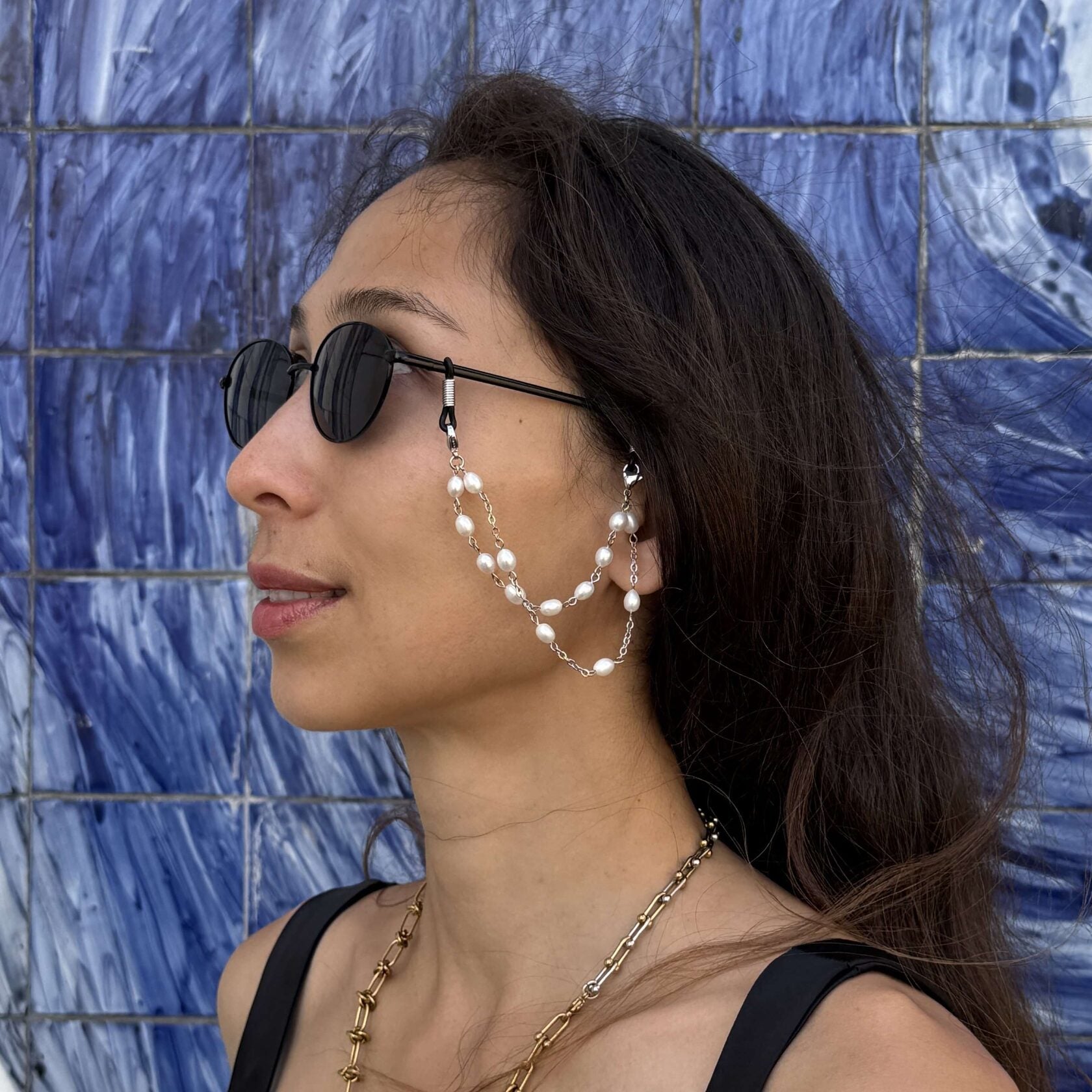 An elegant glasses chain crafted from stainless steel and adorned with natural freshwater pearls. The alternating pattern of fine chain links and luminous pearls creates a light, graceful drape around the face. Perfect for sunny days, travel, or adding a touch of refinement to everyday wear — Pearl Loop is both beautiful and practical.