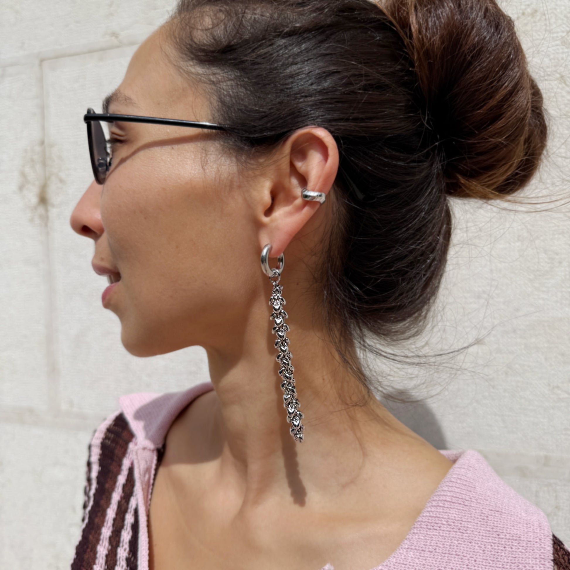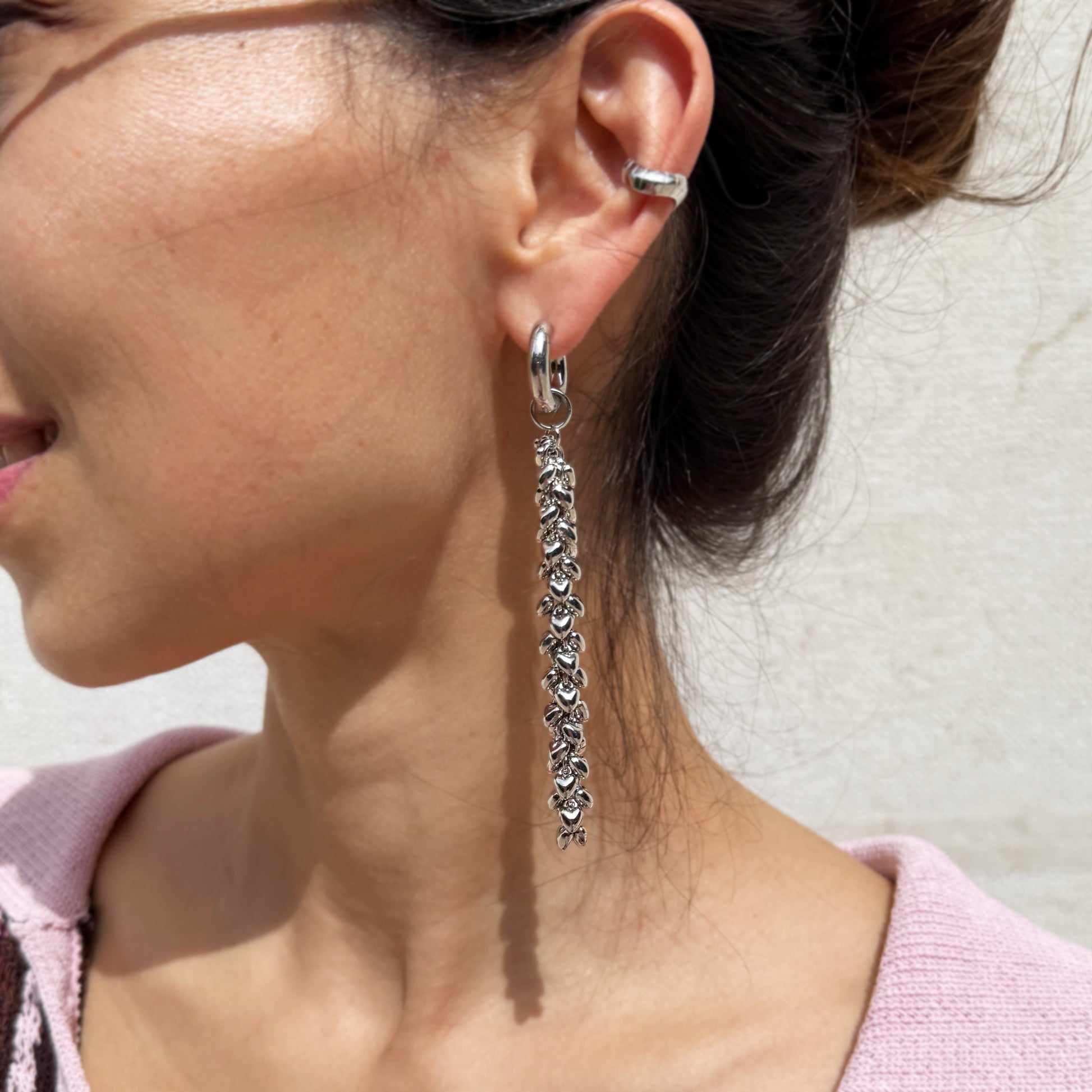 The pendant is a striking blend of modern elegance and intricate design. Crafted from durable steel with rhodium plating, these statement pieces feature a cascading arrangement of heart-shaped acrylic beads linked by delicate chain segments. The elongated silhouette creates a dramatic yet sophisticated look, perfect for adding edgy glamour to any outfit. The lightweight construction ensures comfort while the reflective rhodium finish enhances its sleek, contemporary appeal. Ideal for elevating casual ensembles or making a bold fashion statement at evening events.