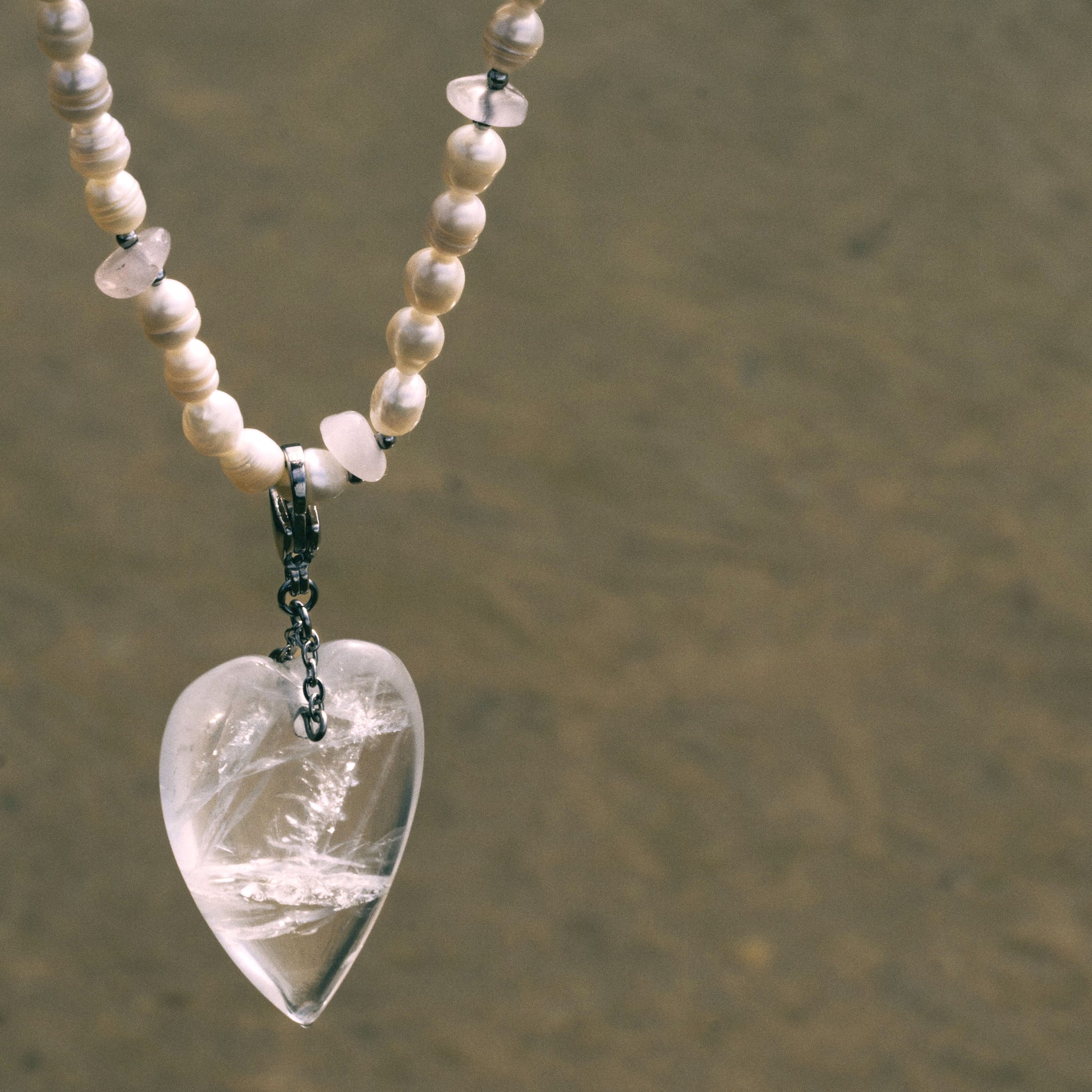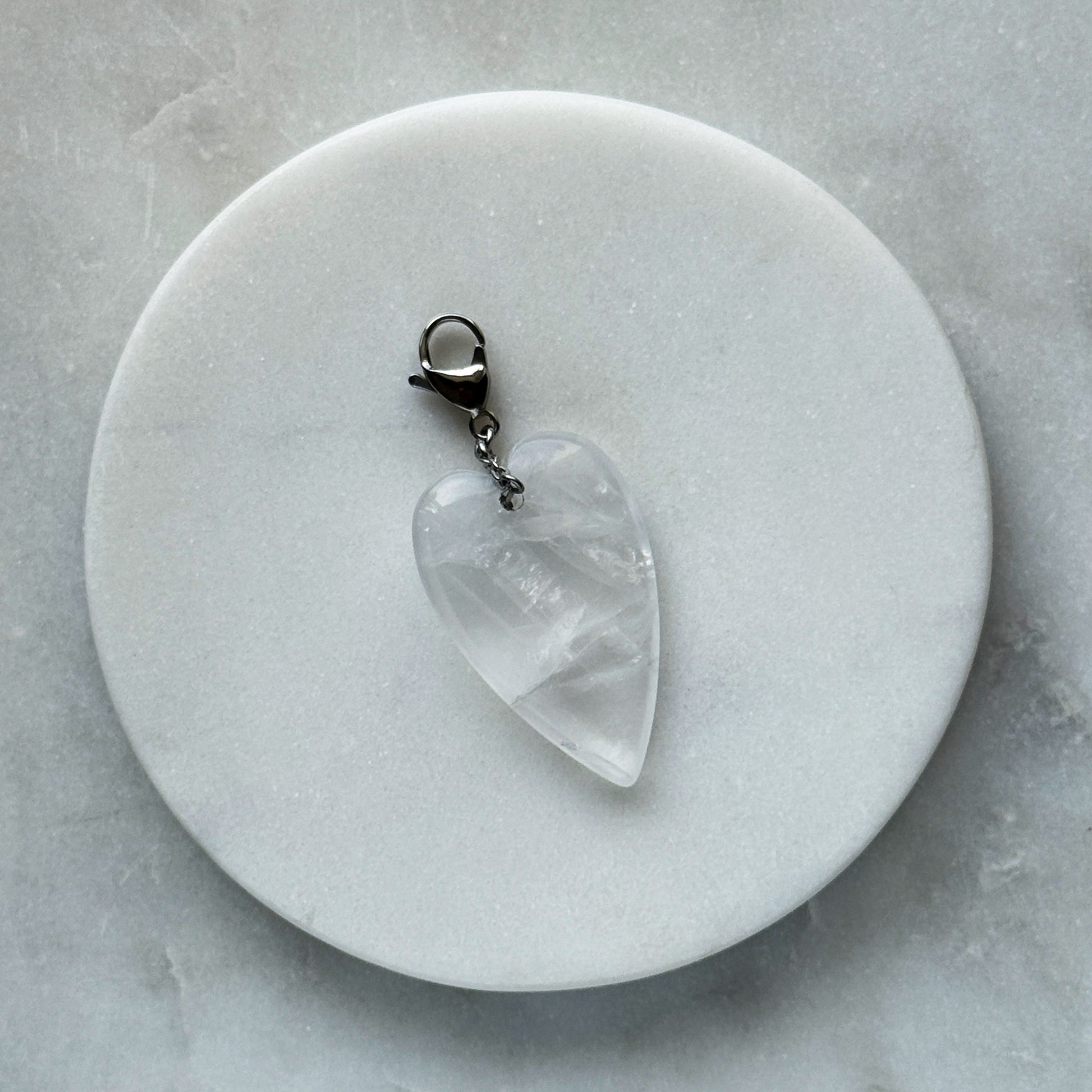 A luminous heart-shaped pendant crafted from pristine rock crystal, featuring a sleek stainless steel carabiner clasp. Its faceted teardrop form captures light with prismatic brilliance, while the cool, translucent hue evokes serenity. Perfect for layering with chains or attaching to bags, this piece blends crisp mineral elegance with modern functionality. Hypoallergenic and durable, it symbolizes clarity and timeless love, ideal for minimalist or bohemian ensembles.