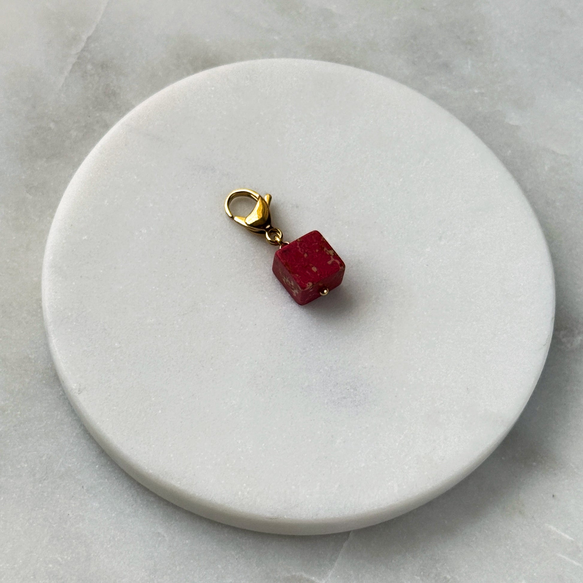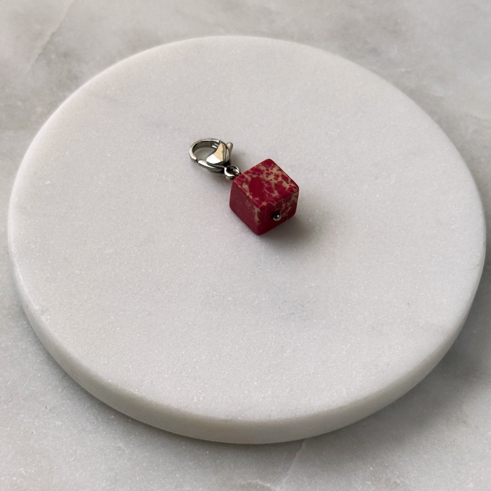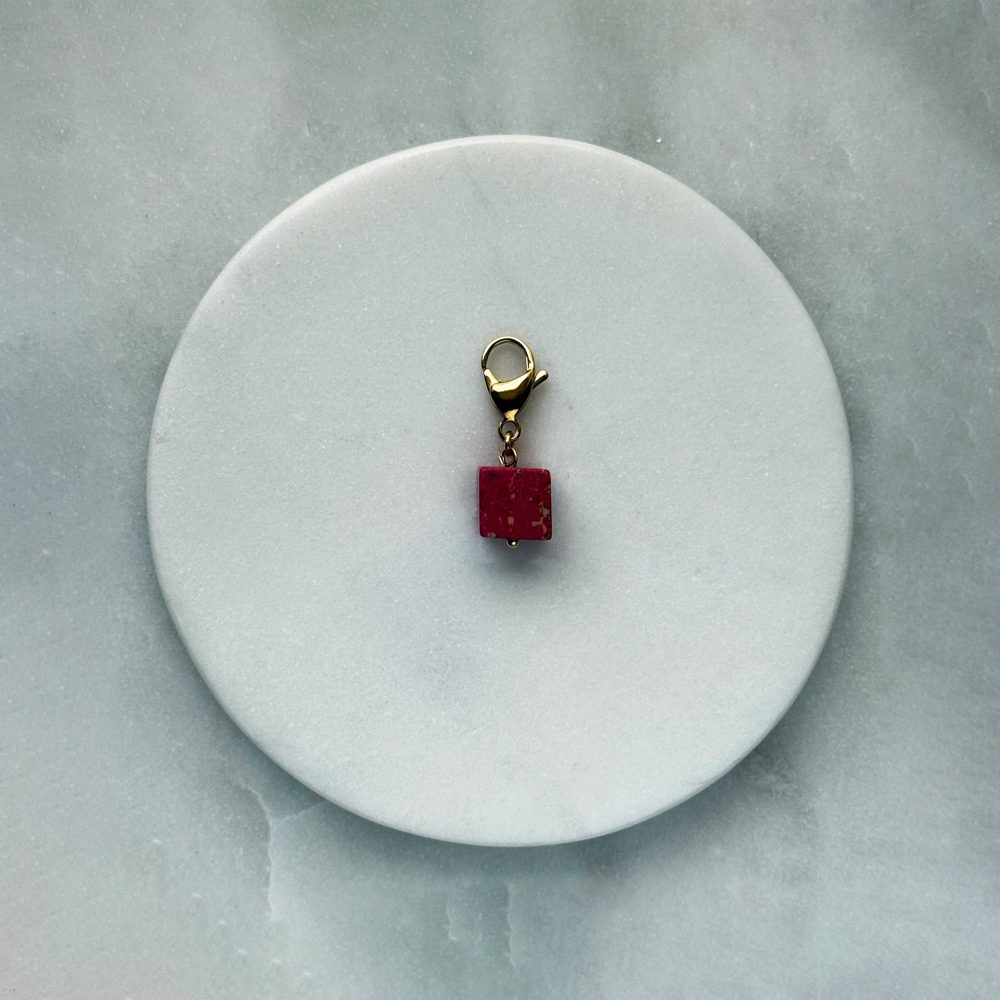 A vibrant pink variscite cube, veined with natural patterns, hangs from a sleek steel carabiner. Its bold color and geometric form contrast beautifully with the cool metal, creating modern minimalism with organic warmth. Lightweight and versatile, it’s a quiet statement piece for bags or chains — elegance grounded in nature’s artistry.