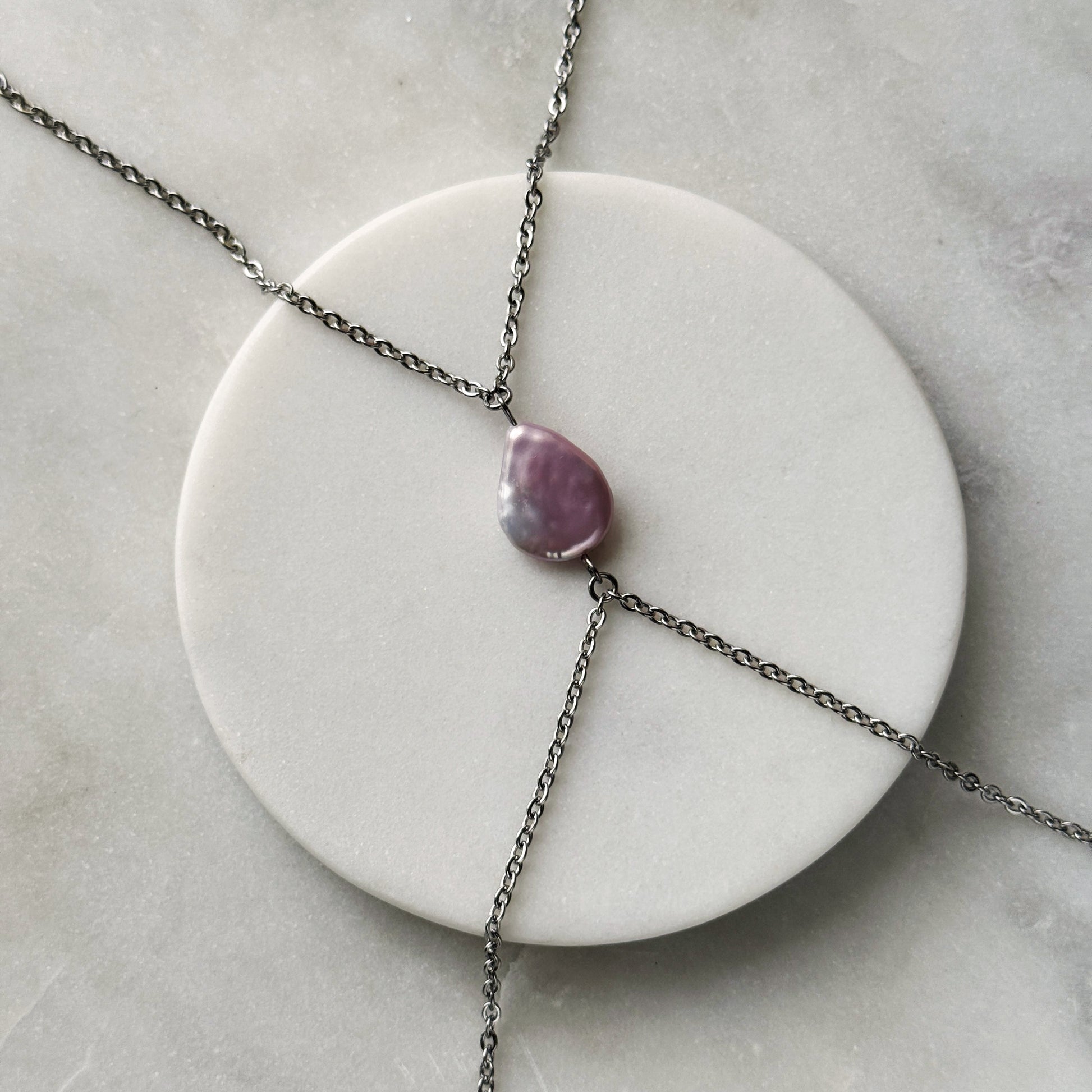 A delicate steel chain features a natural pink pearl as its focal point, designed to drape gracefully across the torso. The pearl’s soft, organic shape contrasts with the cool metal, creating a subtle yet sophisticated statement. Lightweight and versatile, it adds refined elegance to any look — a minimalist celebration of natural beauty and modern design.