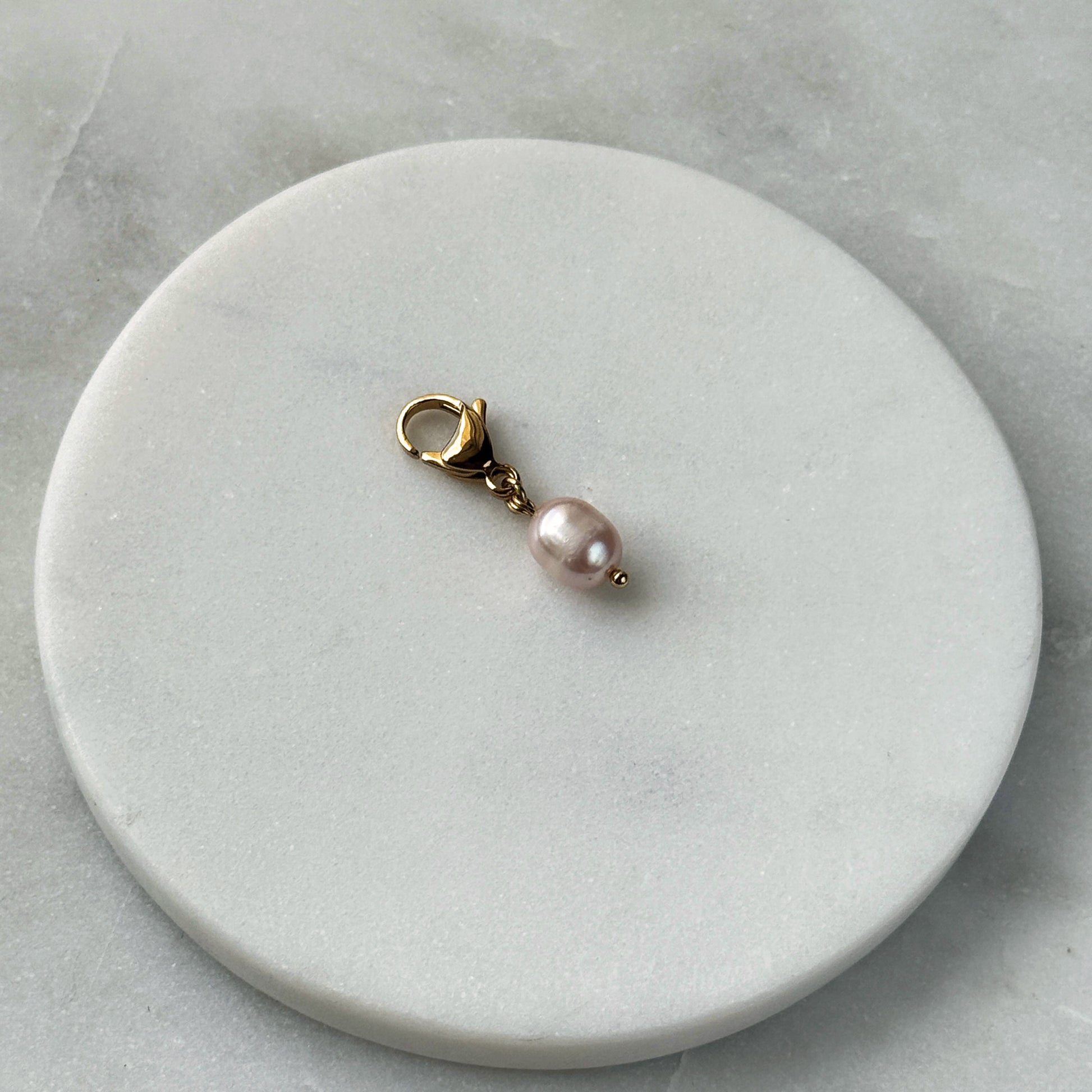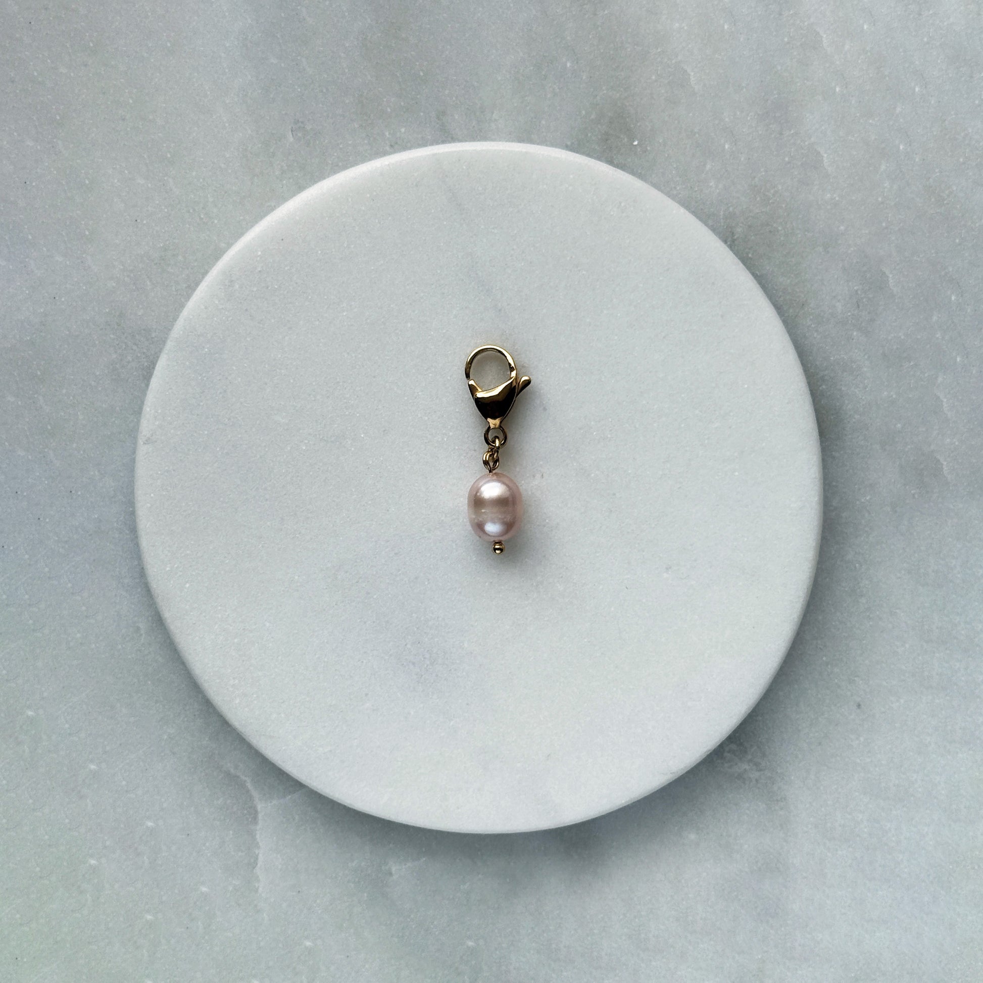 A soft pink pearl, gently oval and luminous, hangs from a warm gold-toned clasp. Its subtle blush and organic curves catch light with quiet charm. The rich metal complements its delicate hue, creating a refined contrast. Lightweight and graceful, it’s a whisper of warmth — an elegant touch for keys, journals, or everyday essentials