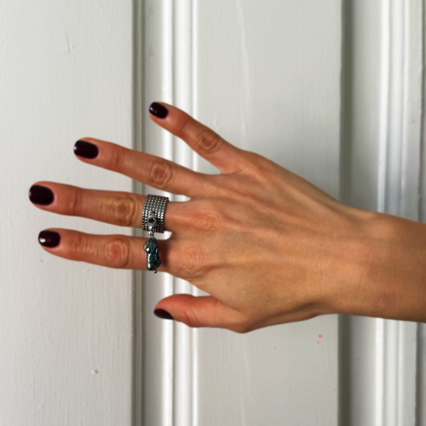 Crafted from steel, this customizable ring base offers four distinct variations—Silver Rows, Silver Dots, Gold Rows, or Gold Dots—selectable via dropdown menu. Designed as a versatile foundation for transformers, its textured surface creates balanced visual interest while enhancing hand features through the law of correspondence. A modern, adaptable accessory that elevates any ensemble with strategic proportions, timeless craftsmanship, and personalized style.