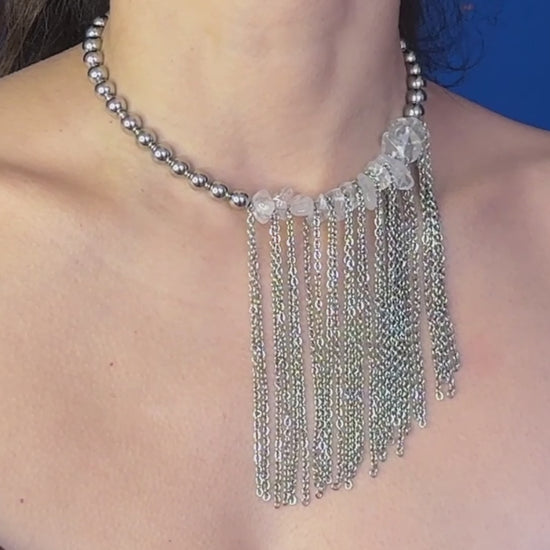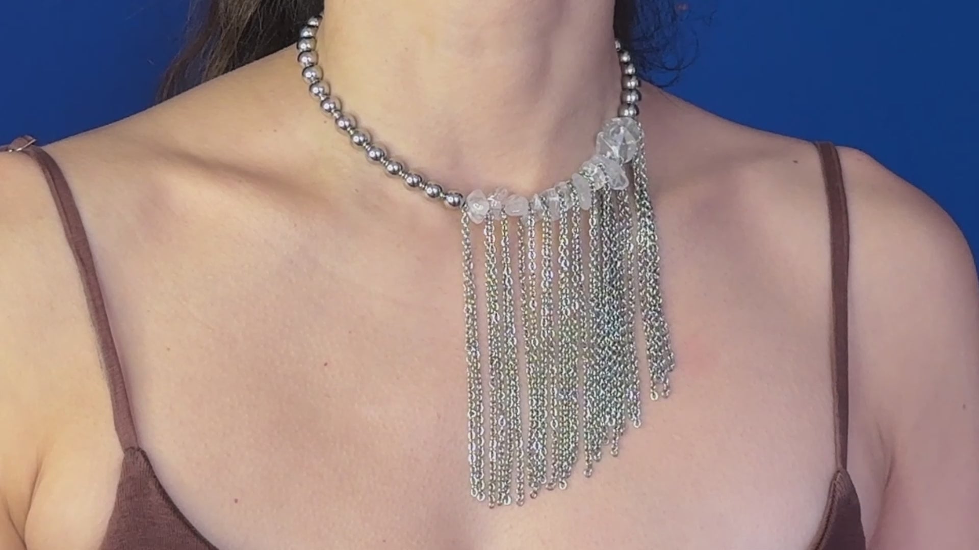Featuring natural rock crystal and polished steel, this statement necklace showcases cascading chains that create dynamic movement and balanced contrast. Following the law of correspondence, its structured design enhances natural features while maintaining modern elegance. Versatile for everyday or formal wear, it adds sophisticated detail through strategic texture and timeless craftsmanship, elevating any ensemble with its harmonious blend of organic and metallic elements.