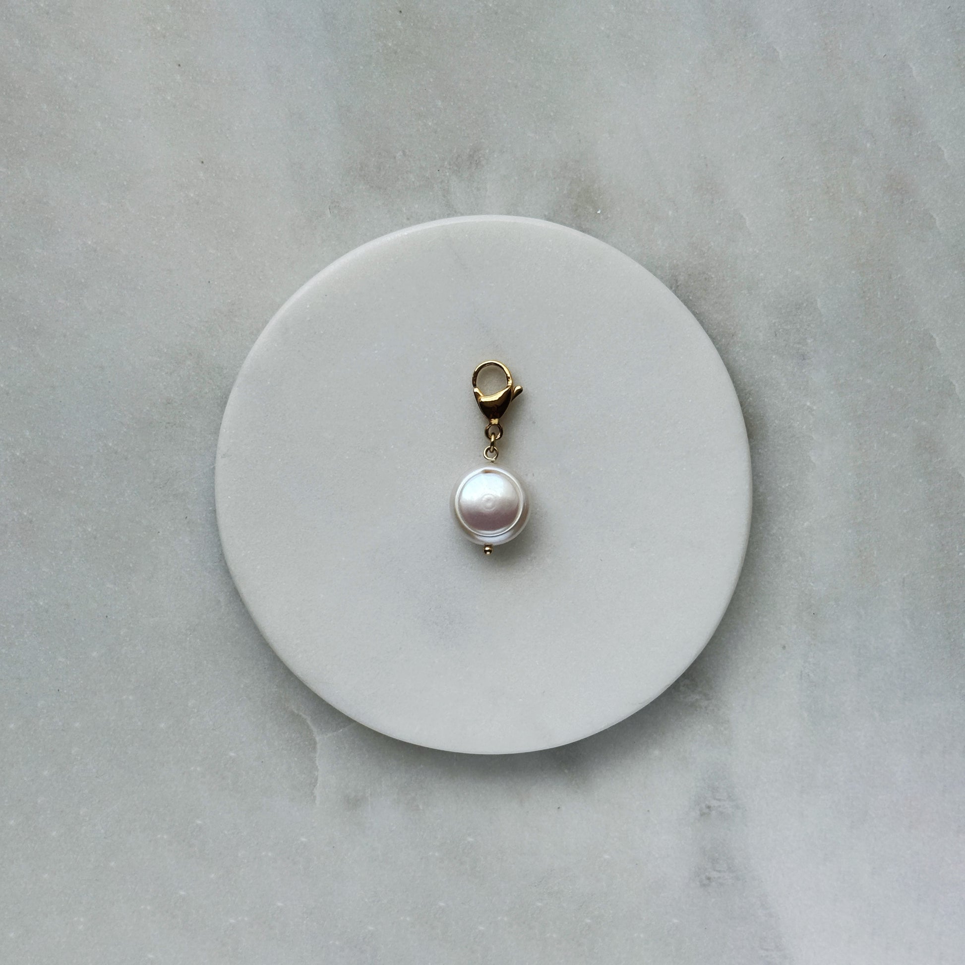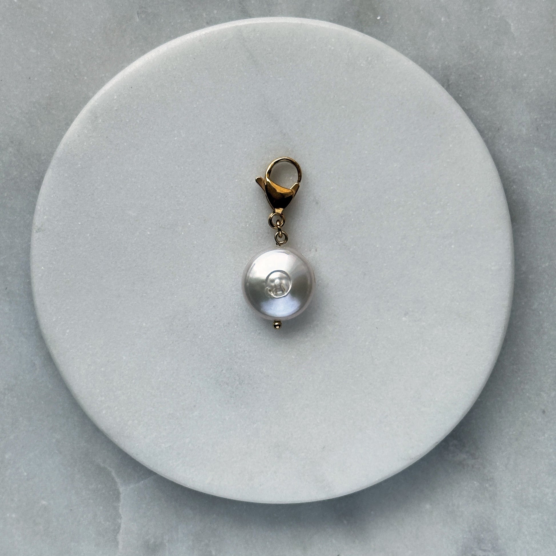 A single, perfectly rounded natural pearl glows with soft luster, suspended from a gleaming gold-toned clasp. Its smooth, full form and gentle iridescence exude timeless elegance. The warm metal enhances its quiet radiance, making it a refined accent for bags or chains — classic sophistication distilled into one luminous, wearable moment