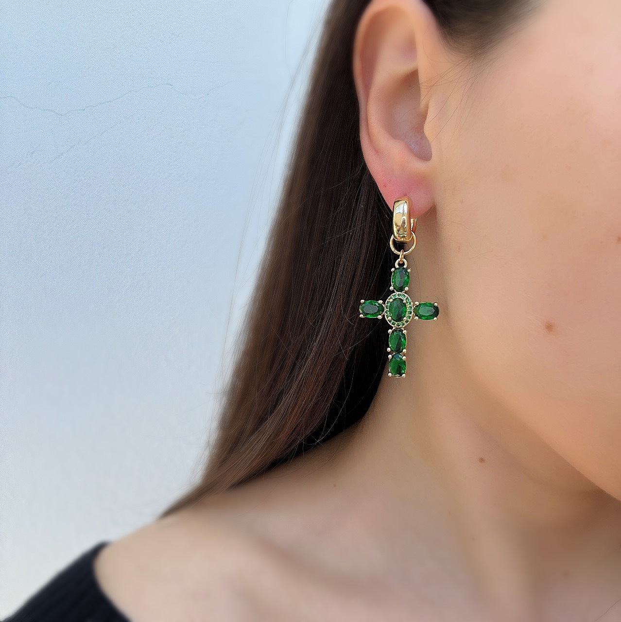 A stunning cubic zirconia cross, elegantly set in 18-carat gold plating. This piece symbolizes faith, mystery, and timeless sophistication, making it a radiant addition to any collection. You can wear it on both chains and earrings.