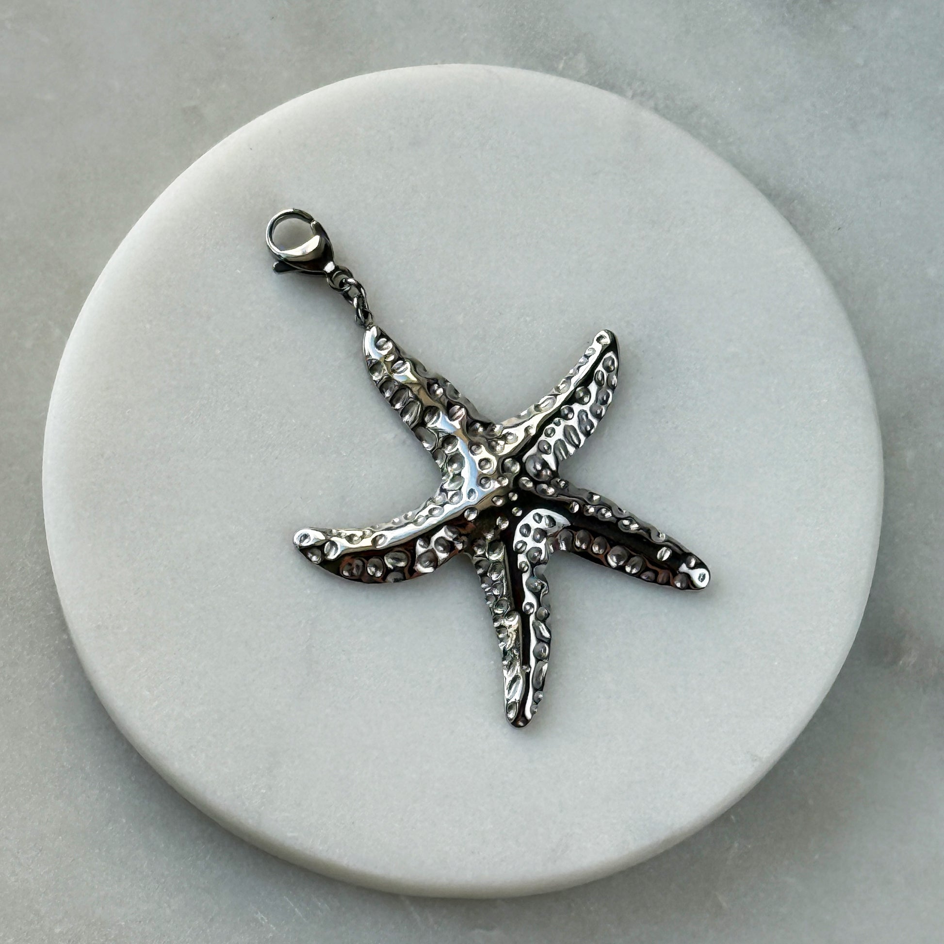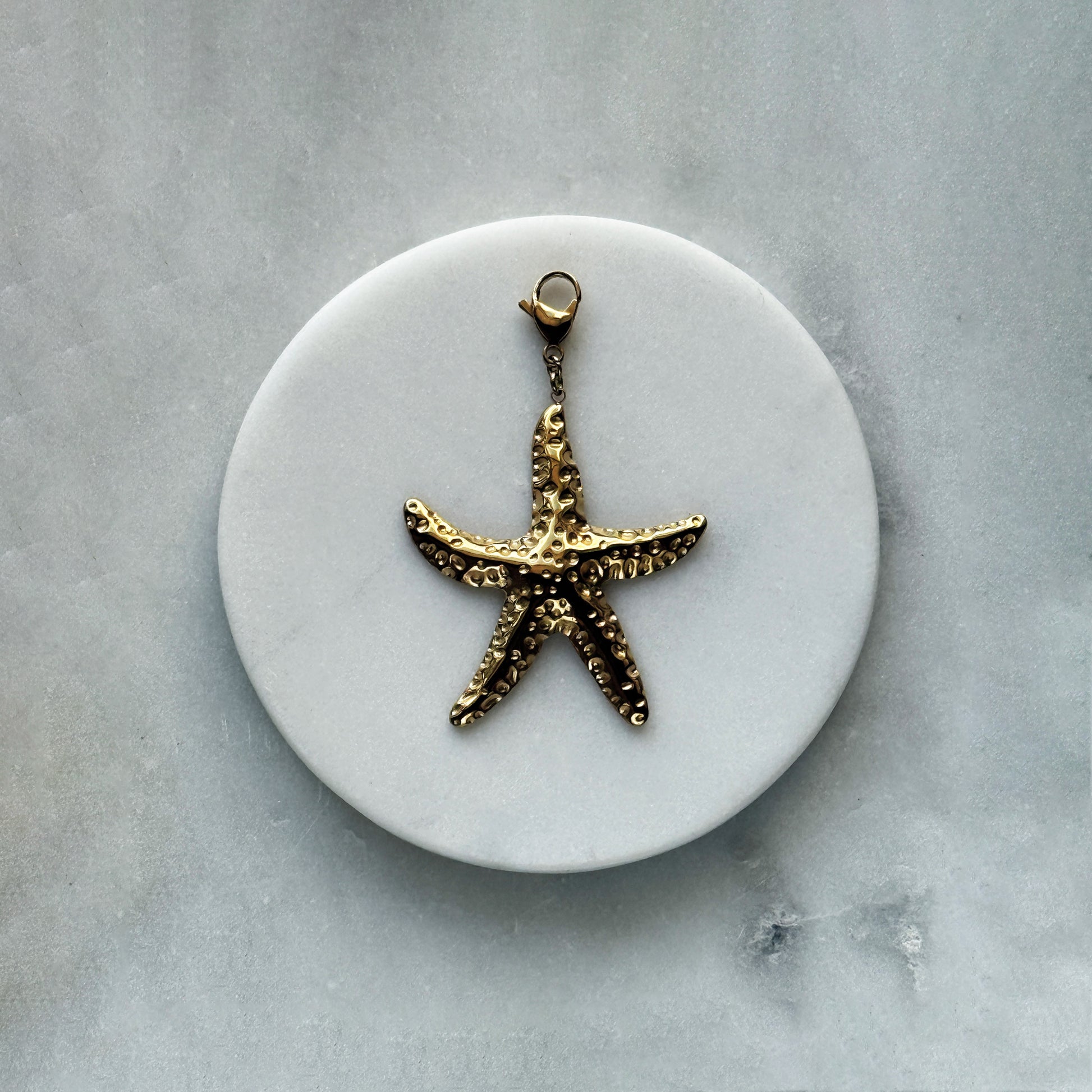 A radiant starfish pendant in steel with 24K gold plating. Angular beams radiate from a central core, with matte accents contrasting against glossy edges. Use as a scarf fastener, standalone jewelry accent, or part of a curated set. Its bold geometry suits glamorous casual styles—from oversized sweaters to tailored suits—adding subtle luxury without excess.