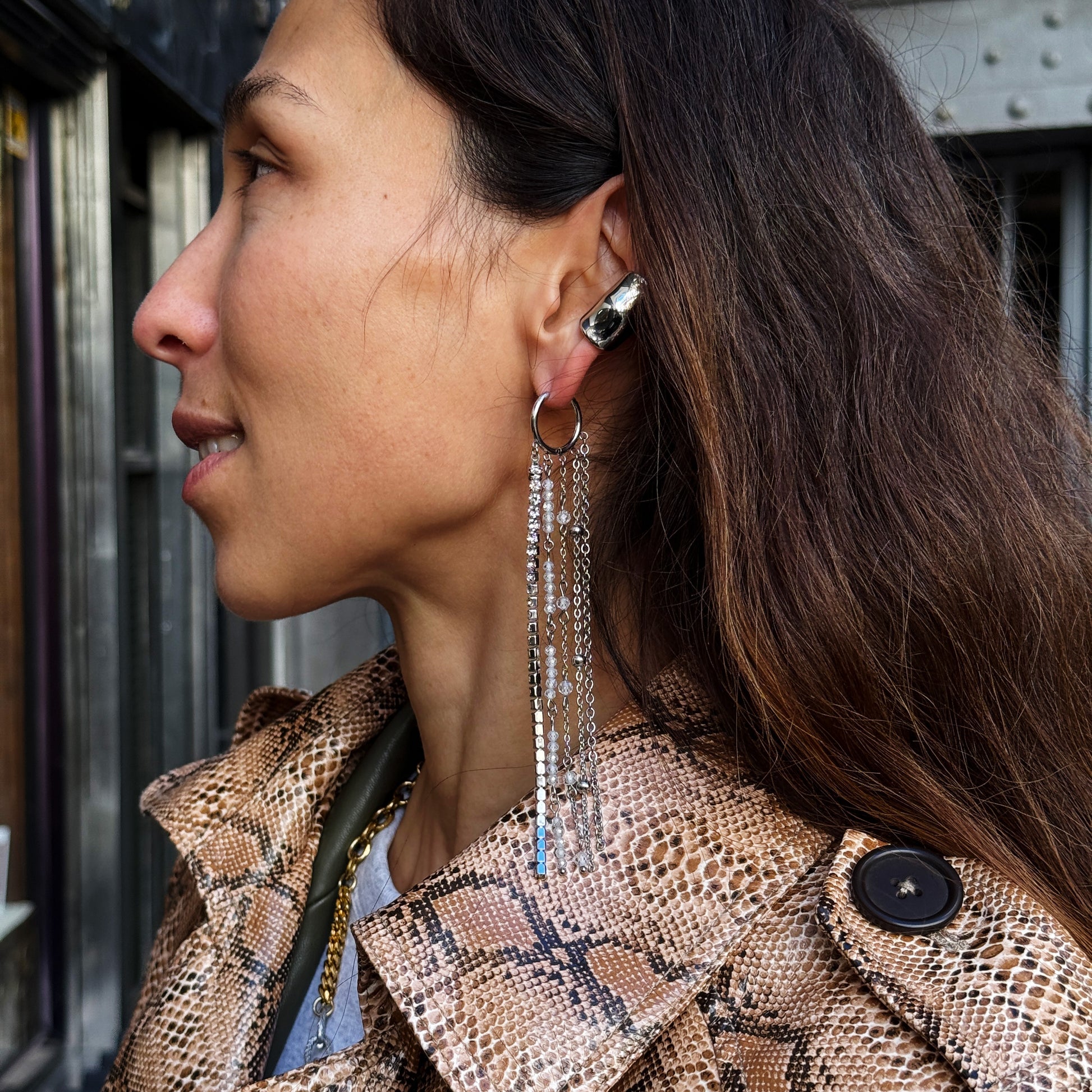 This statement single earring creates dynamic texture contrast through its cascading crystal design. Following the law of correspondence, the sparkling crystals and steel chains complement facial features while maintaining balance. Crafted with crystals and cubic zirconia on steel base, it adds sophisticated movement to any look. The asymmetric design enhances natural beauty through strategic visual interest without overpowering your style.