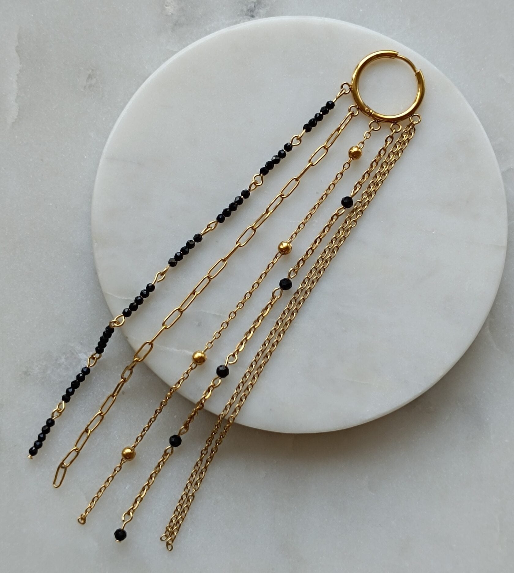 The Spinel Tassel Earring features a stunning combination of 24-carat gold-plated stainless steel and striking black spinel stones. This single earring is designed with cascading chains and delicate beaded accents, creating an elegant, tassel-like effect. The bold design offers a perfect mix of sophistication and modern style, making it a unique statement piece for any occasion. The high-quality materials and intricate detailing make this earring a versatile addition to any jewelry collection, ideal for both casual and formal looks.