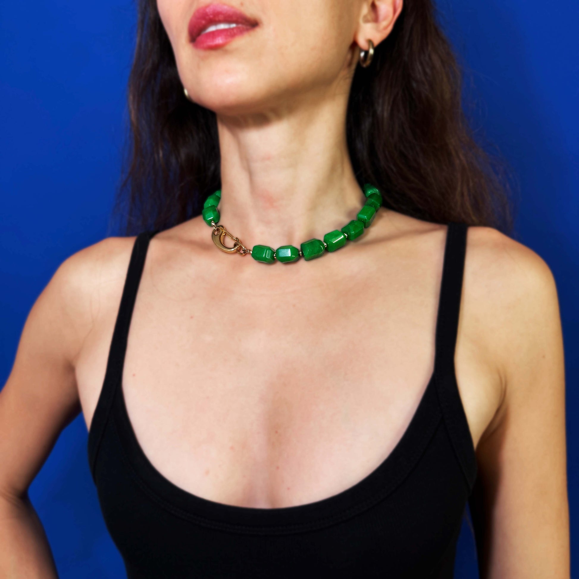 This bold piece features vibrant natural tinted agate beads in rich green tones, set against 24K gold-plated steel hardware. The substantial yet comfortable weight creates a striking focal point that elevates any ensemble. Perfect for adding sophisticated texture to both casual and formal wear, this versatile necklace combines organic beauty with modern craftsmanship. The chunky design makes a powerful fashion statement while maintaining the timeless appeal of natural gemstones.