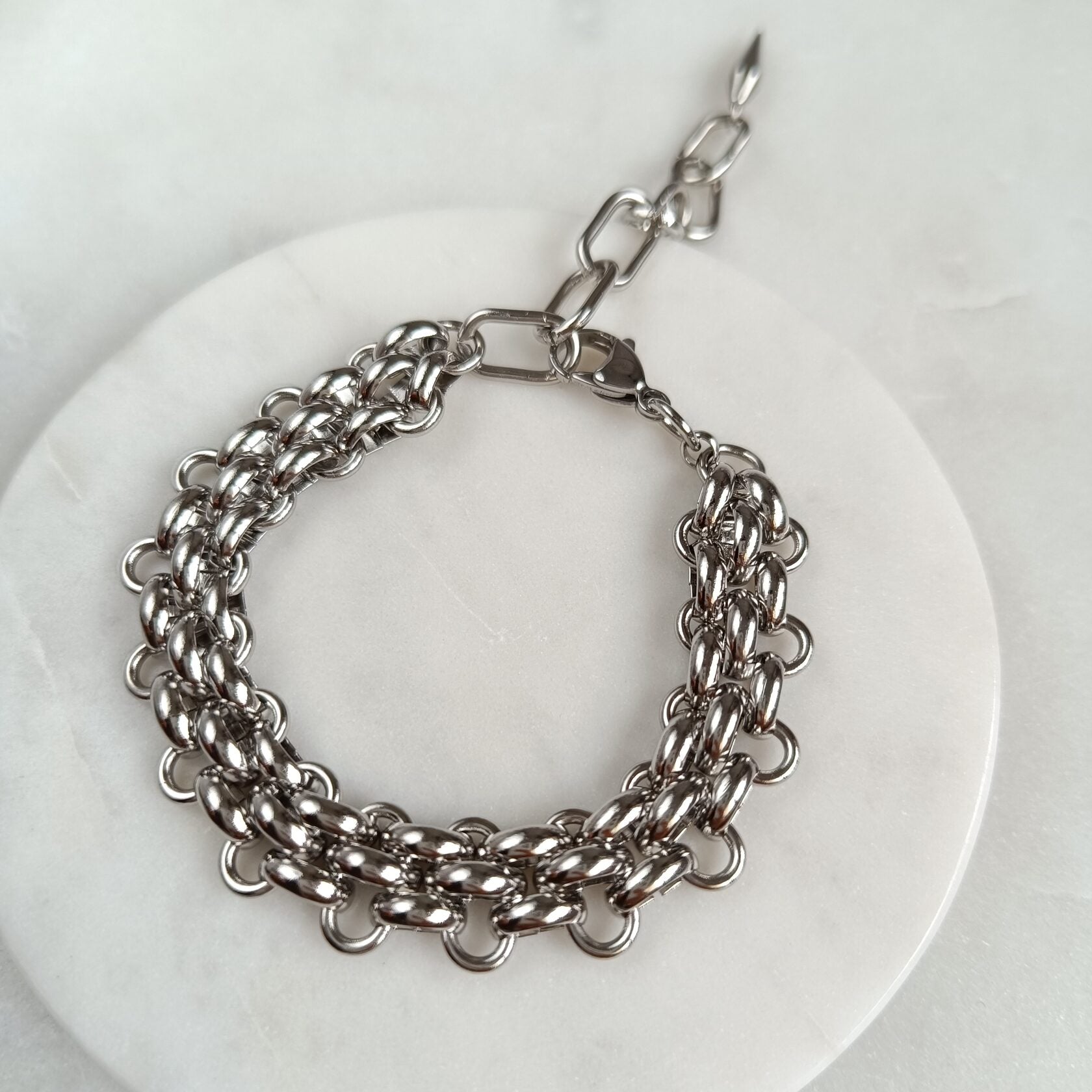 The Titan Bound Bracelet is a statement piece crafted from high-quality stainless steel, exuding strength and modern elegance. This industrial-inspired bracelet features a thick, interwoven chain design that offers both durability and a bold aesthetic.